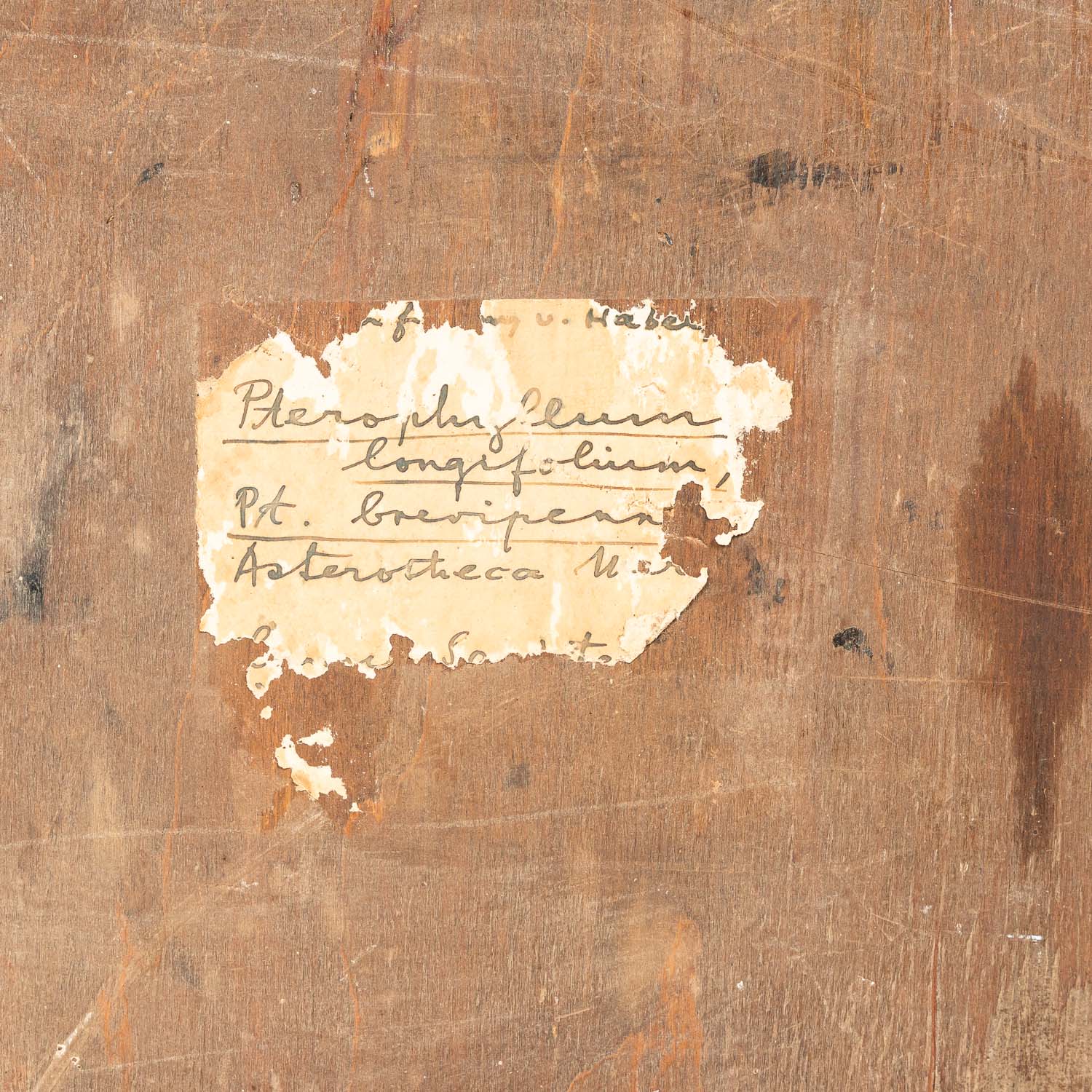 Large Fossil, black stone. Damages. In wooden frame. On the reverse old description. 34,5 x 34 cm.