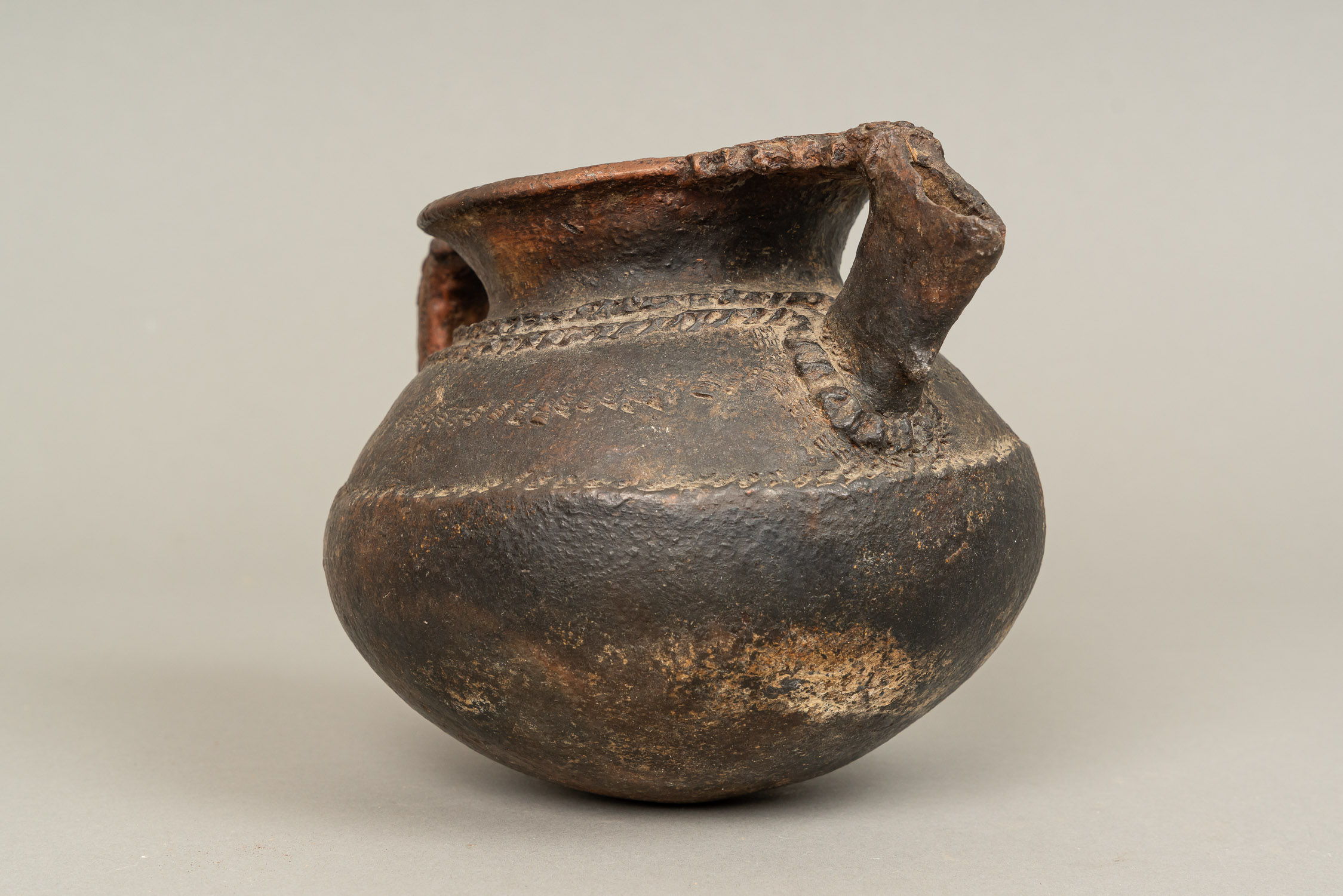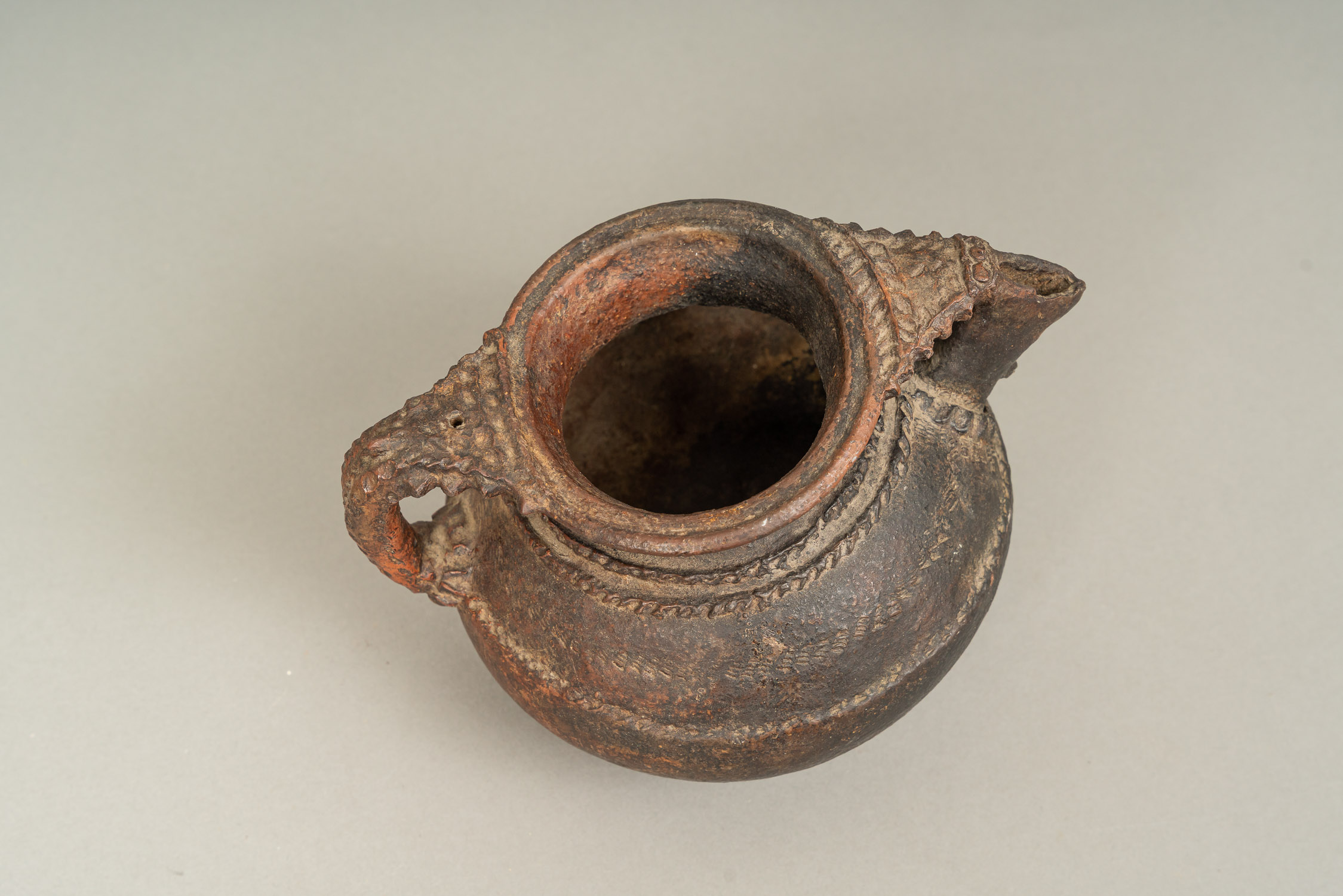 Ancient Ceramic Vessel, bowl shape with handgrip and spout. Decorations. Possibly black sea region. 15 x 22 cm.