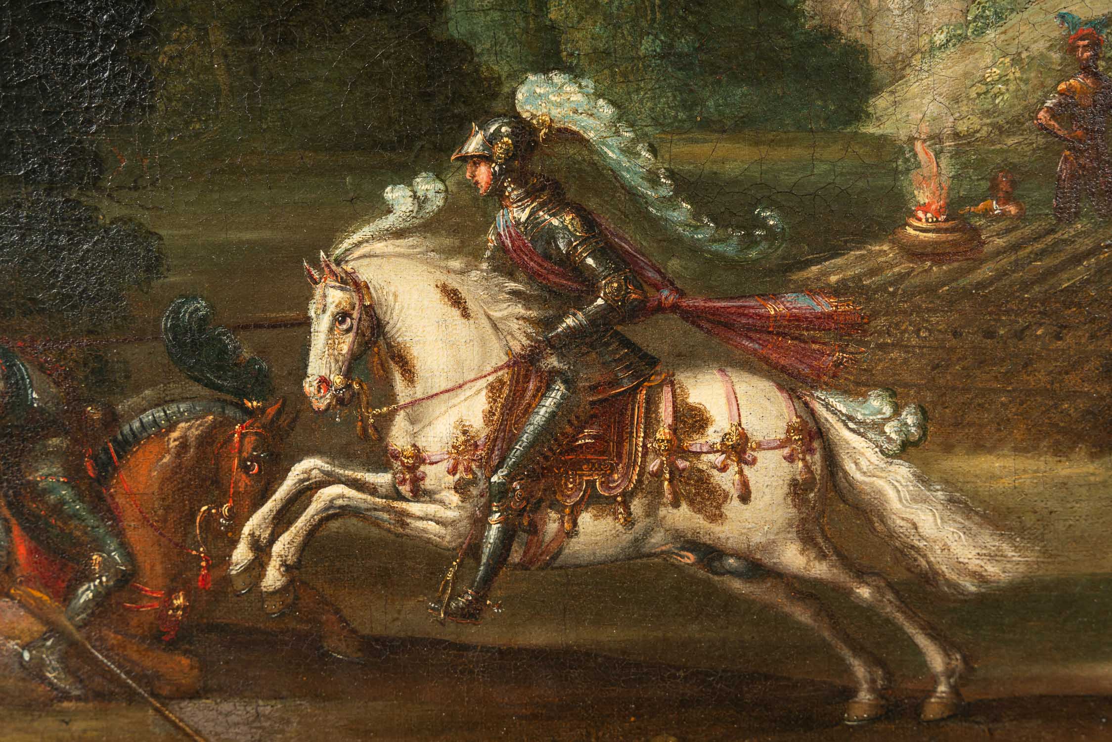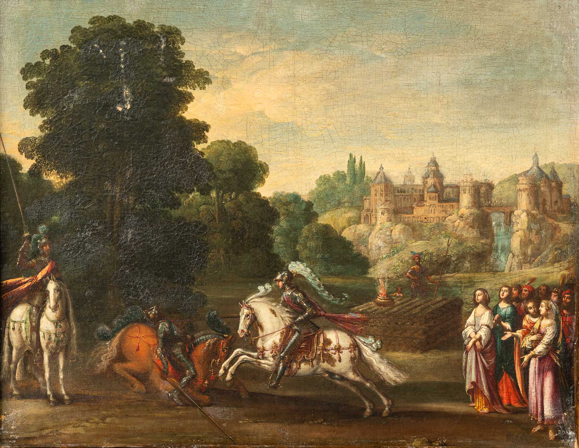Paul Bril (1554-1626)-circle, Tournament in Landscape with court ladys and castle. Oil on canvas. Famed. 50 x 62 cm