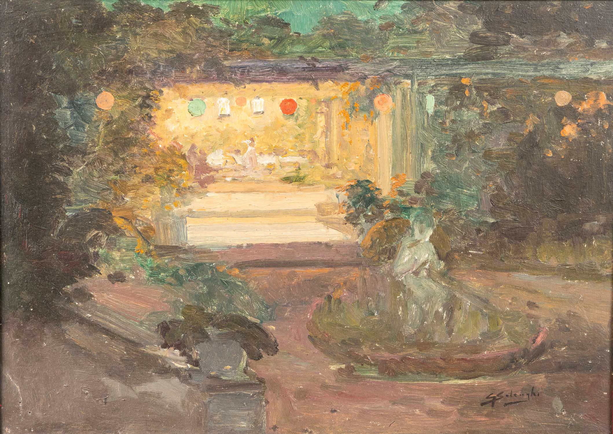 Giuseppe Solenghy ( 1879-1944)- attributed, Park scene with lampions . Oil on board. Signed bottom right. Framed. 34 x 48 cm