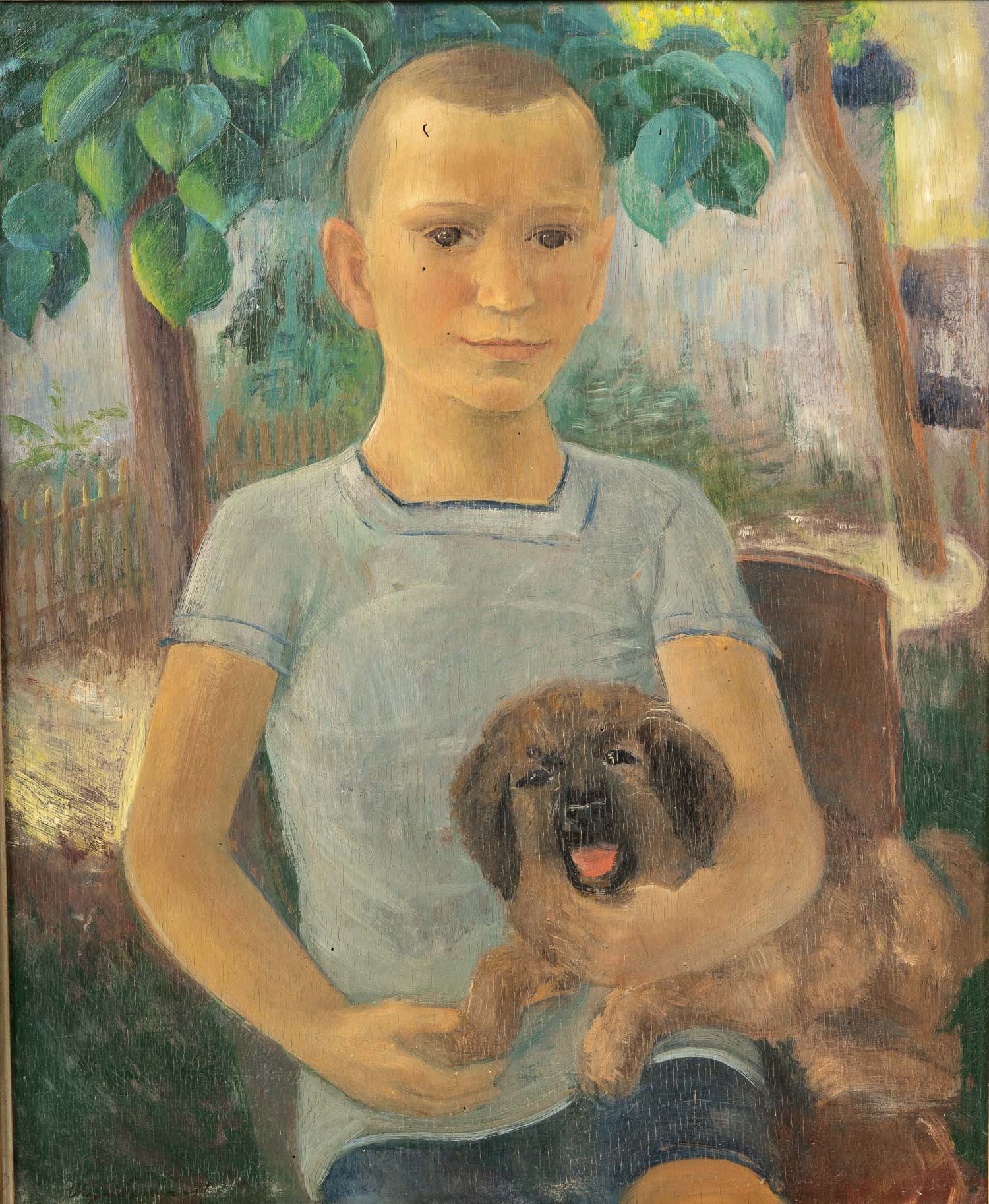 Olga Sacharoff ( 1889-1967) – attributed, Boy with dog. Oil on board. Signed, framed. 68 x 55 cm