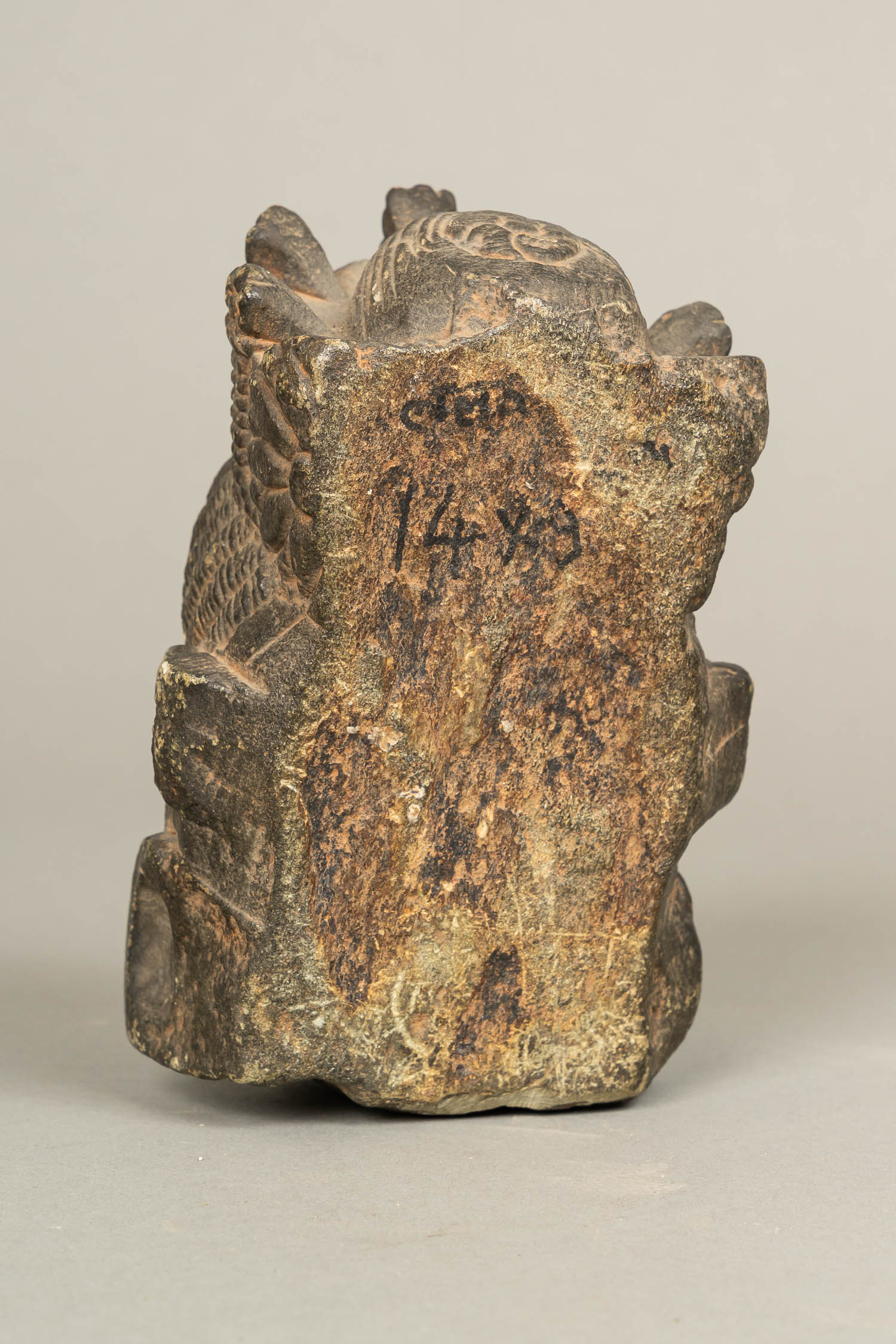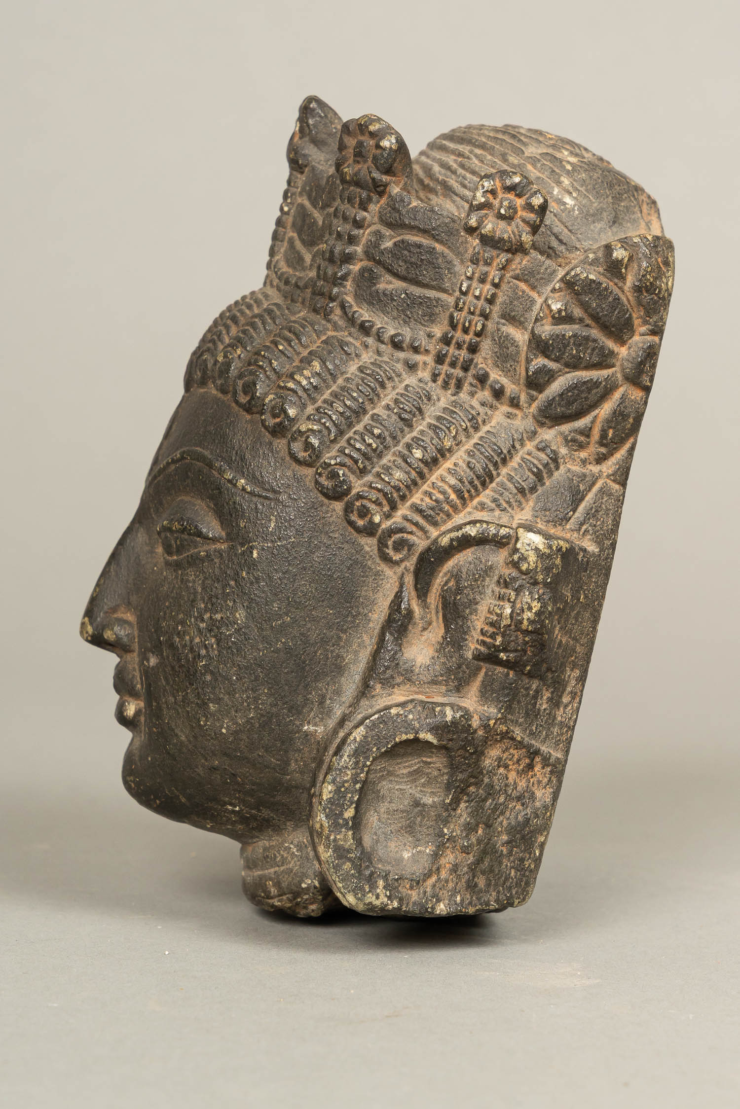 Indochinese Stone Head, of a godness. Sculpted black stone. Probably Burma 13/15th Century. 15 cm high.