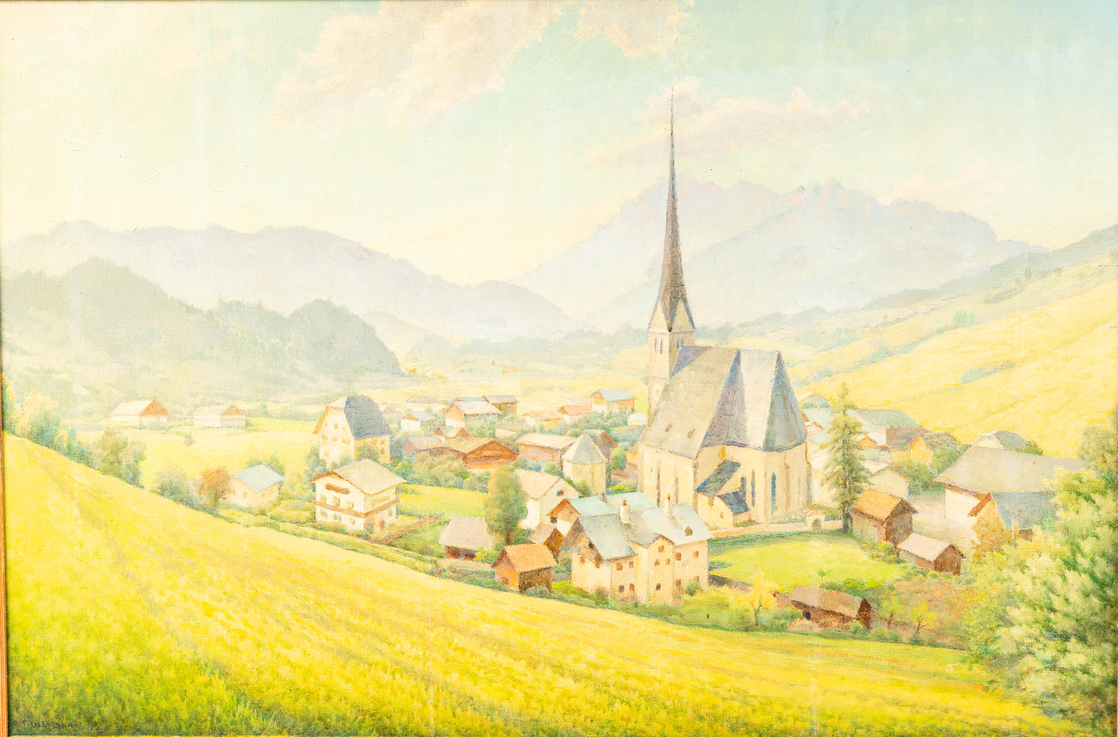 Rudolf Franz Ullmann ( 1889-1973), View of the village Alm at the Leogang mountains. Oil on canvas. Framed. 42 x 63 cm