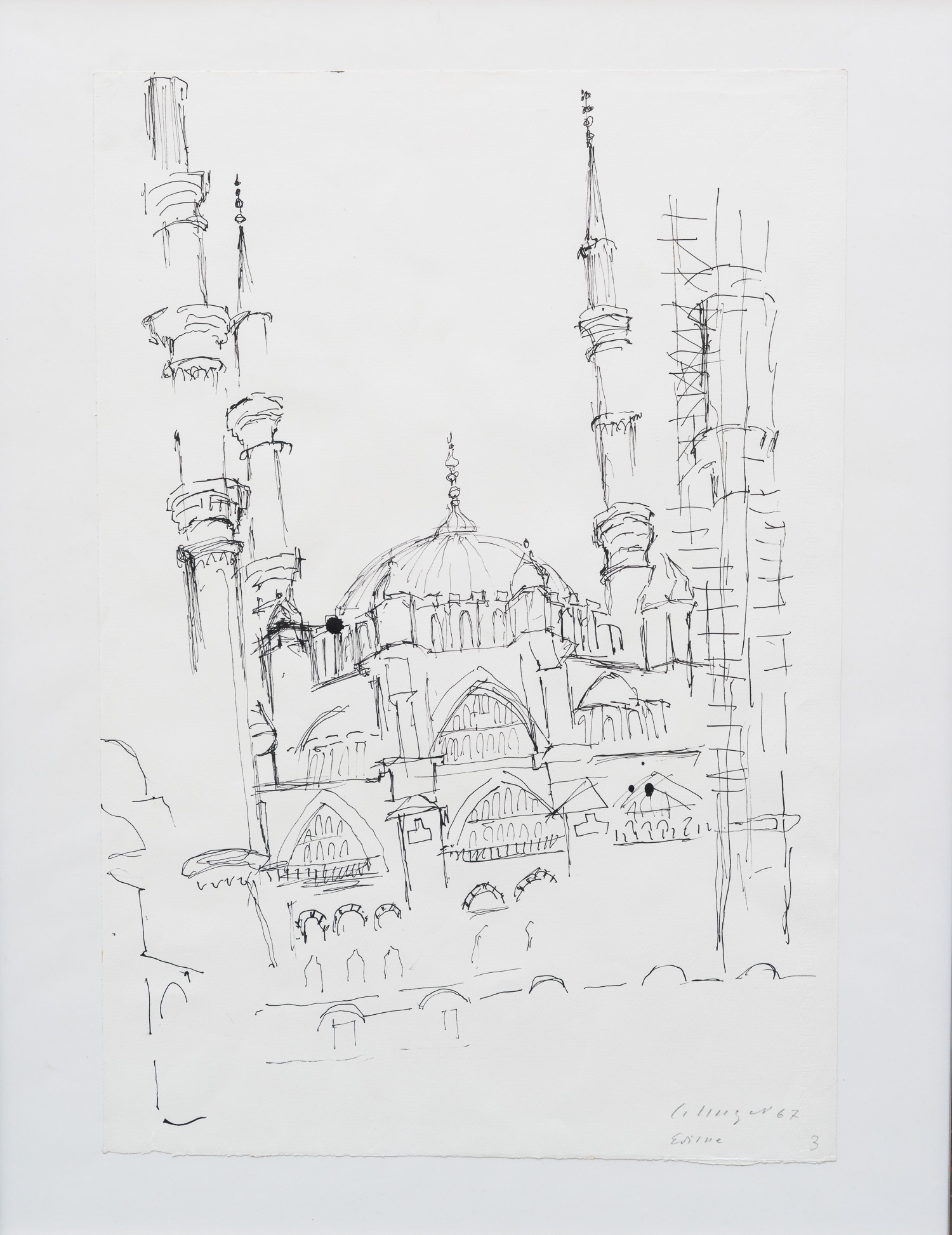 Carl Unger ( 1915-1995), Mosque, indian ink on paper. Signed on the bottom and described Edirne 3 . Framed. 53 x 37 cm . The hammer price will go directly to the social help of the Caritas of Vienna, Provenance; estate found Erzdiozese Wien.