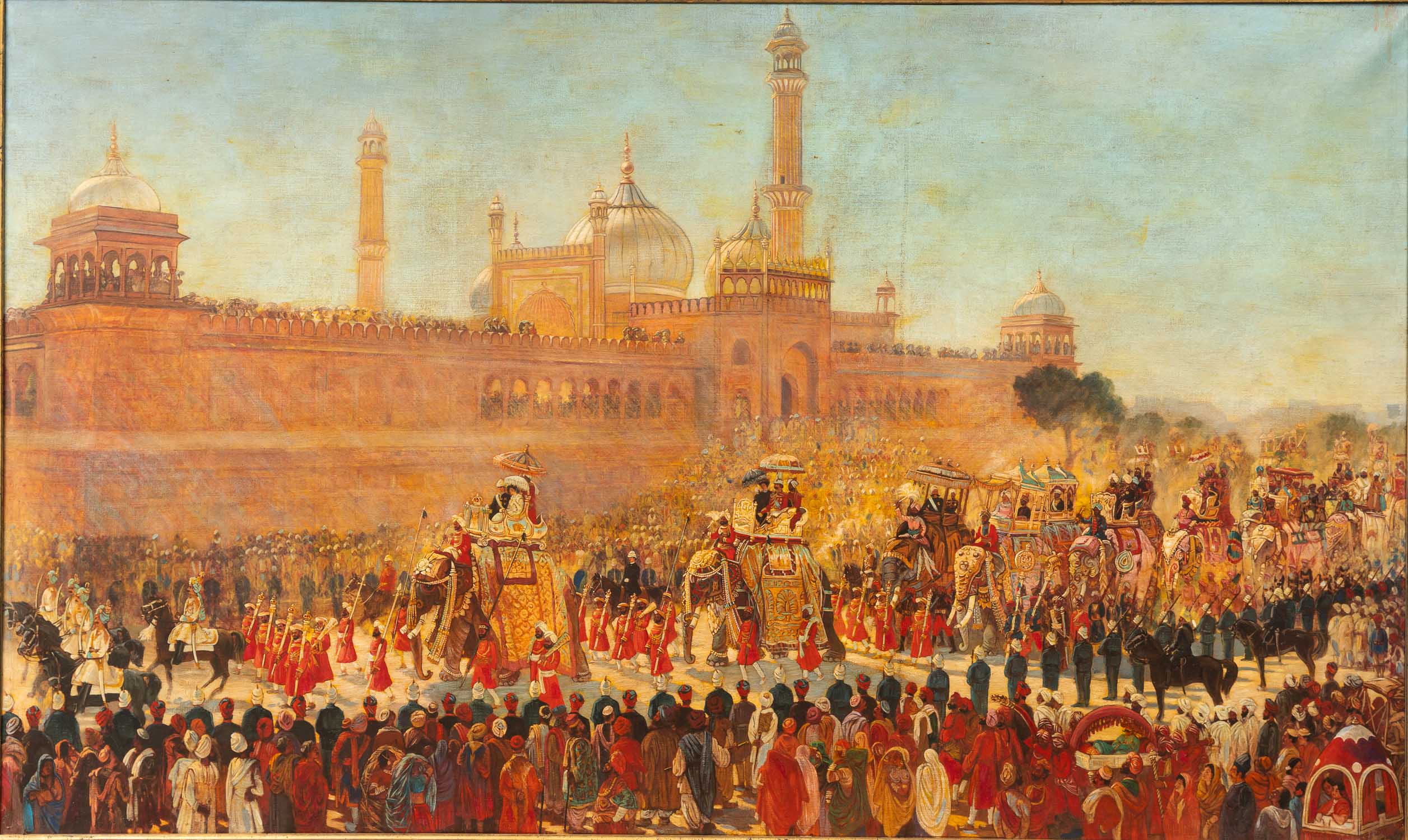 Indian Artist 20th Century, The reception of honourables in front of a Palace and guardian troops and folk . Oil and other different techniques on canvas. Framed. 108 x 180 cm