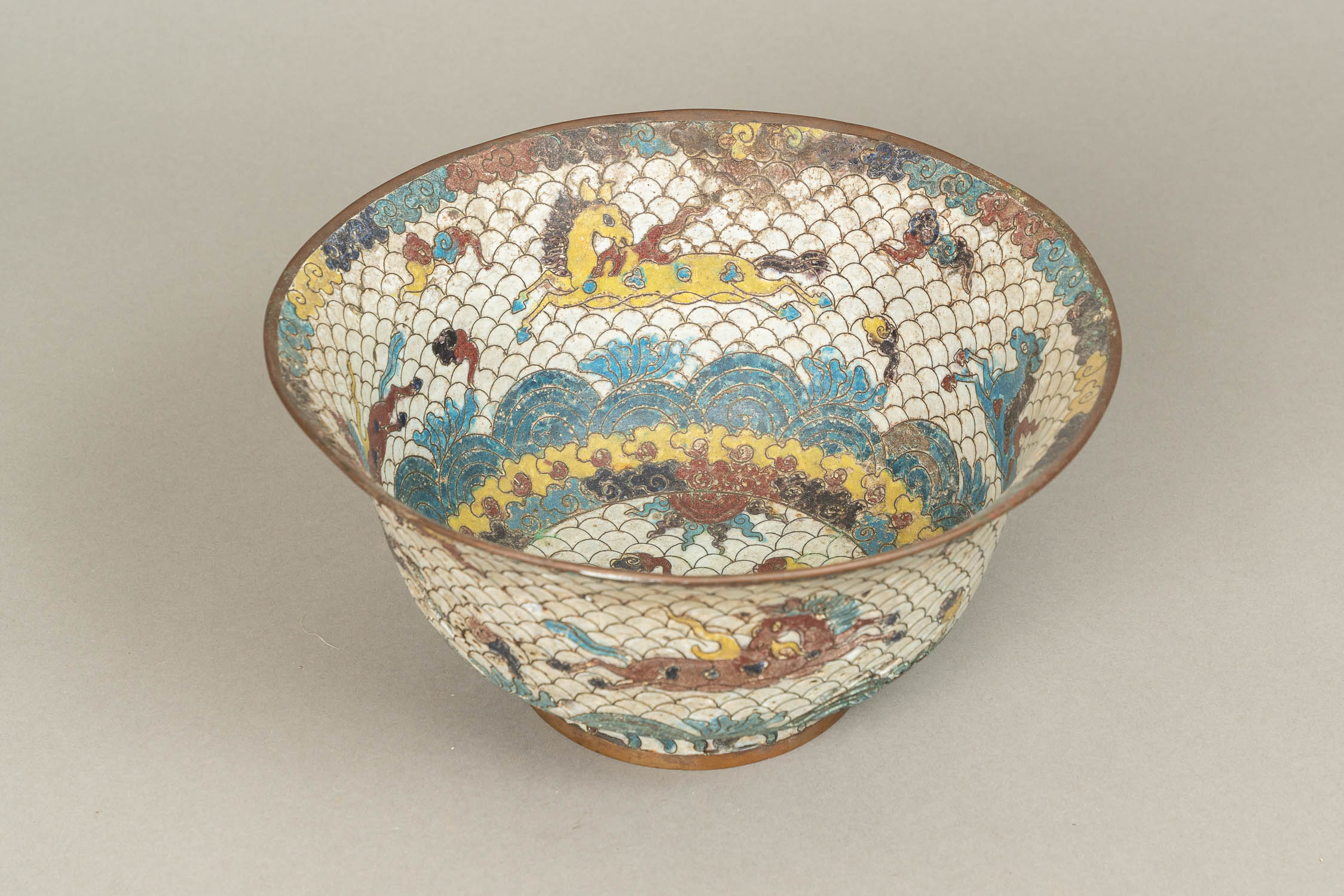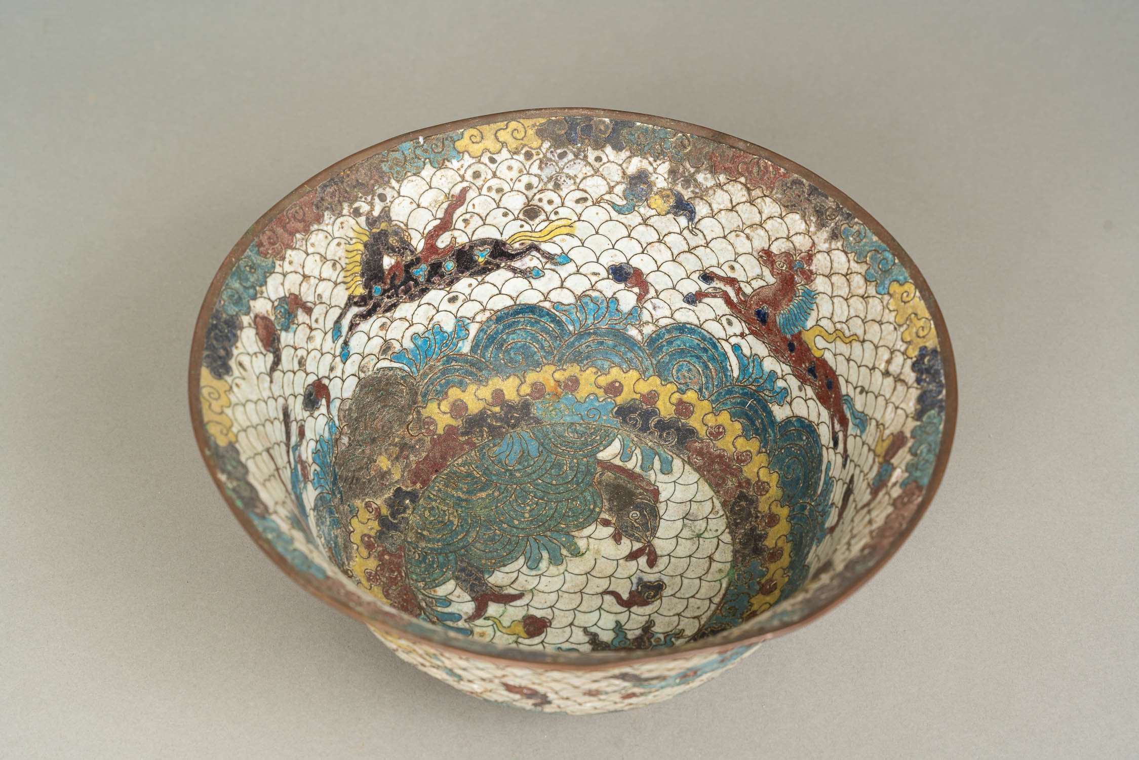 Cloisonne Bowl, China multicoloured enamel. Signed on the bottom. Damages. Quing dinasty. 13 x 26 cm.