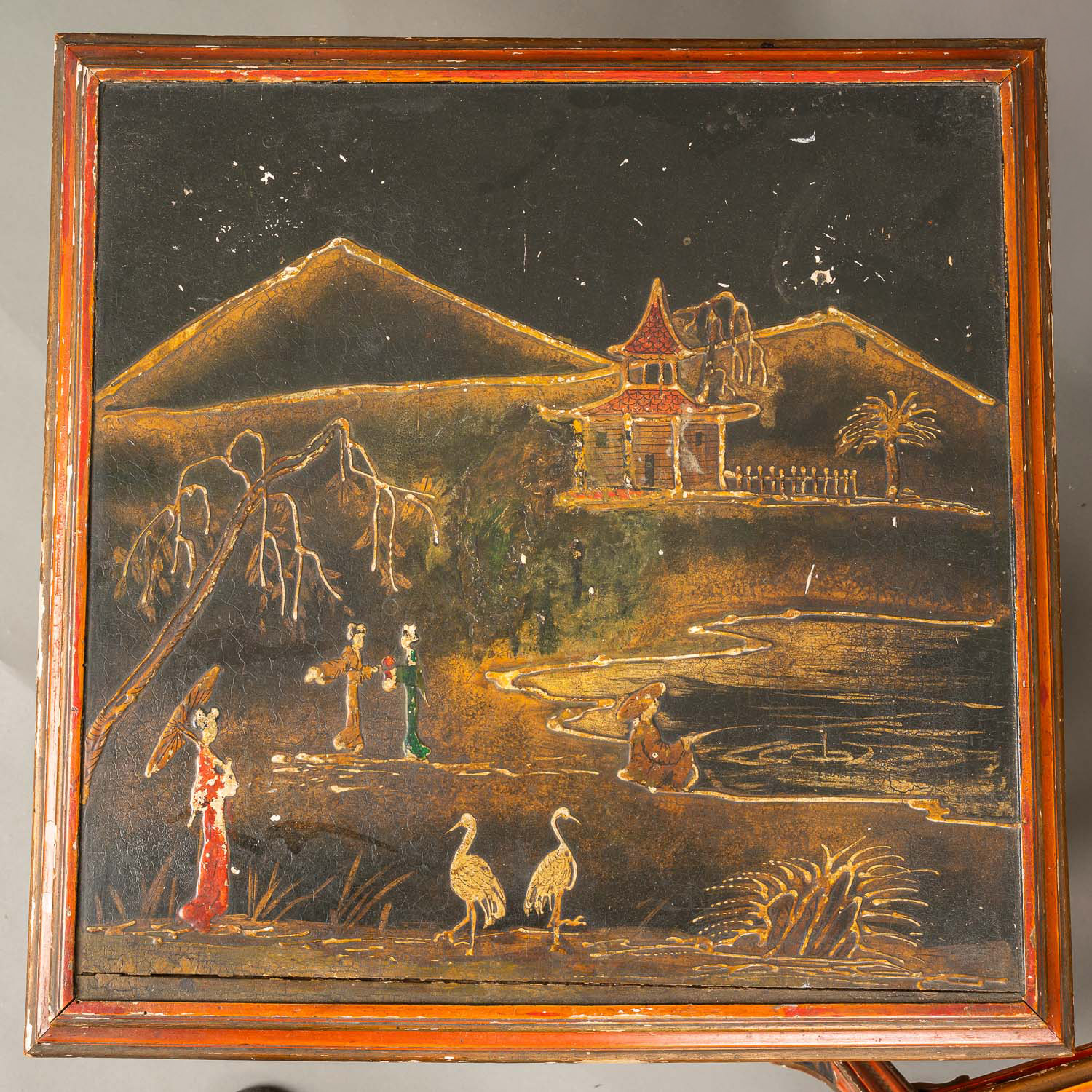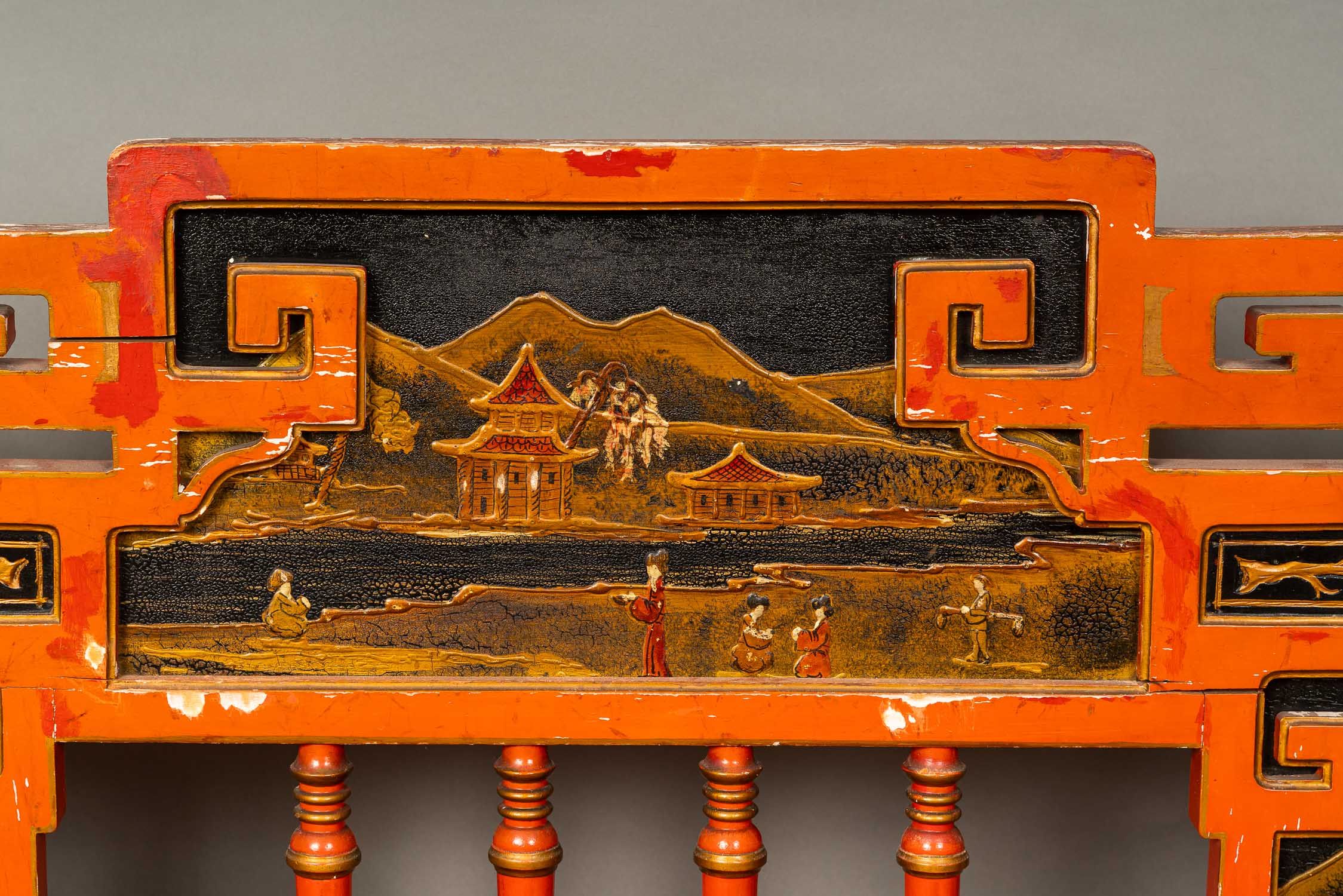 Chinese Sitting group , comprising one sofa, two armchairs, three stools, one plant coloumn and one table. All wood carved with open work and original red black colours. Gilded. Some with lacquer panels. Original textile. Damages. Qing dynasty. Sofa 112 x 56 cm. Sitting high 40 cm. Armchairs 62 x 55 cm, high 90 cm.