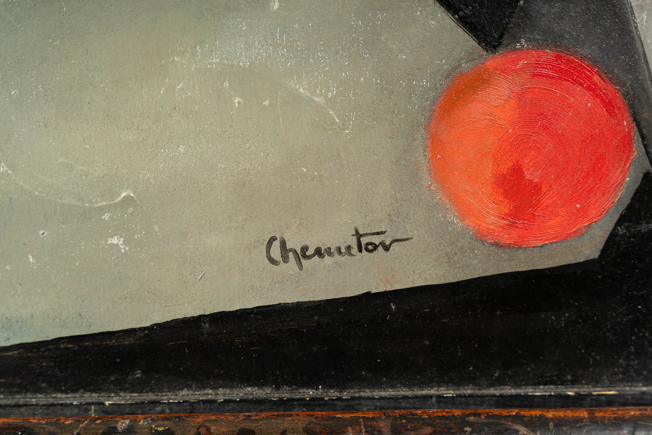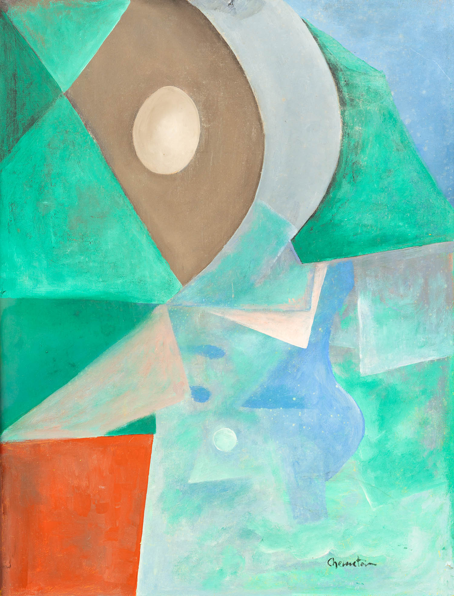 Boris Chemetov ( 1908-1982) – attributed, Cubistic impression . Oil on board 70 x 60 cm . Framed. Signed, on the reverse cubistic compossition in green