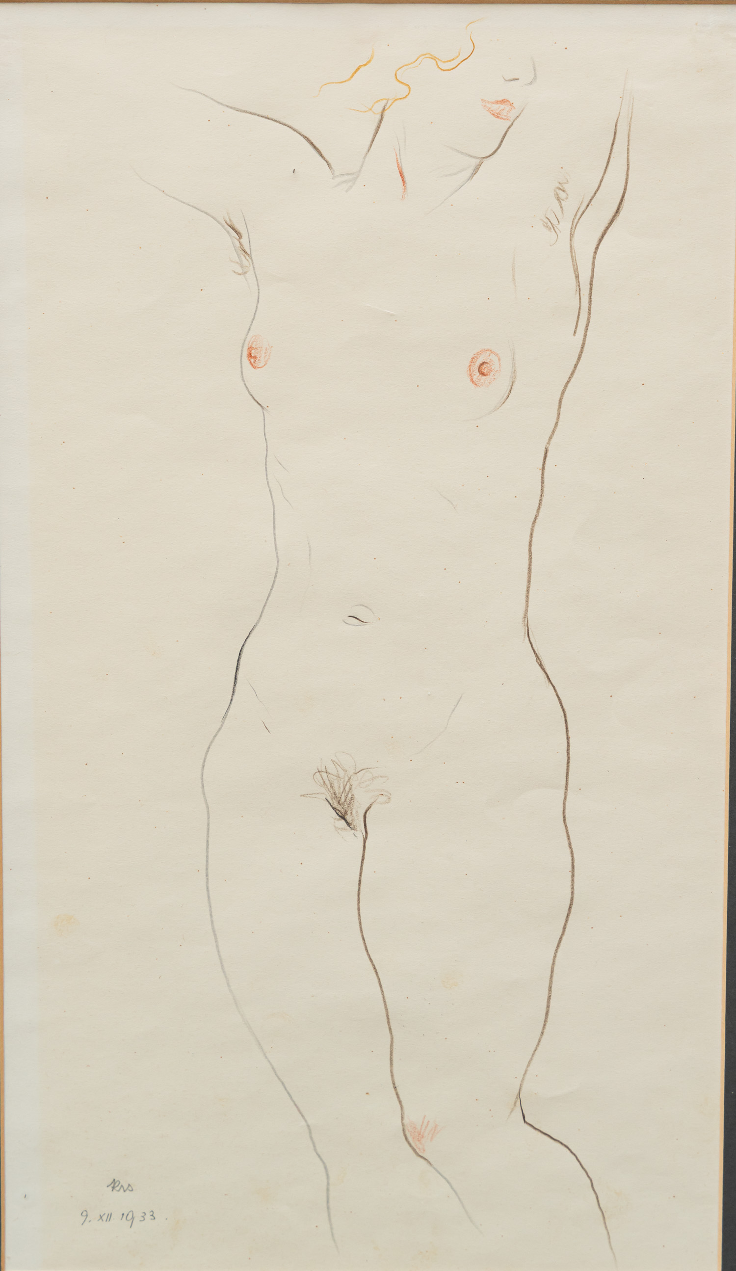 Vienna around 1930, Female nude . Pencil and colour pen on paper. Monogrammed and dated 1933. Framed. 38 x 22 cm