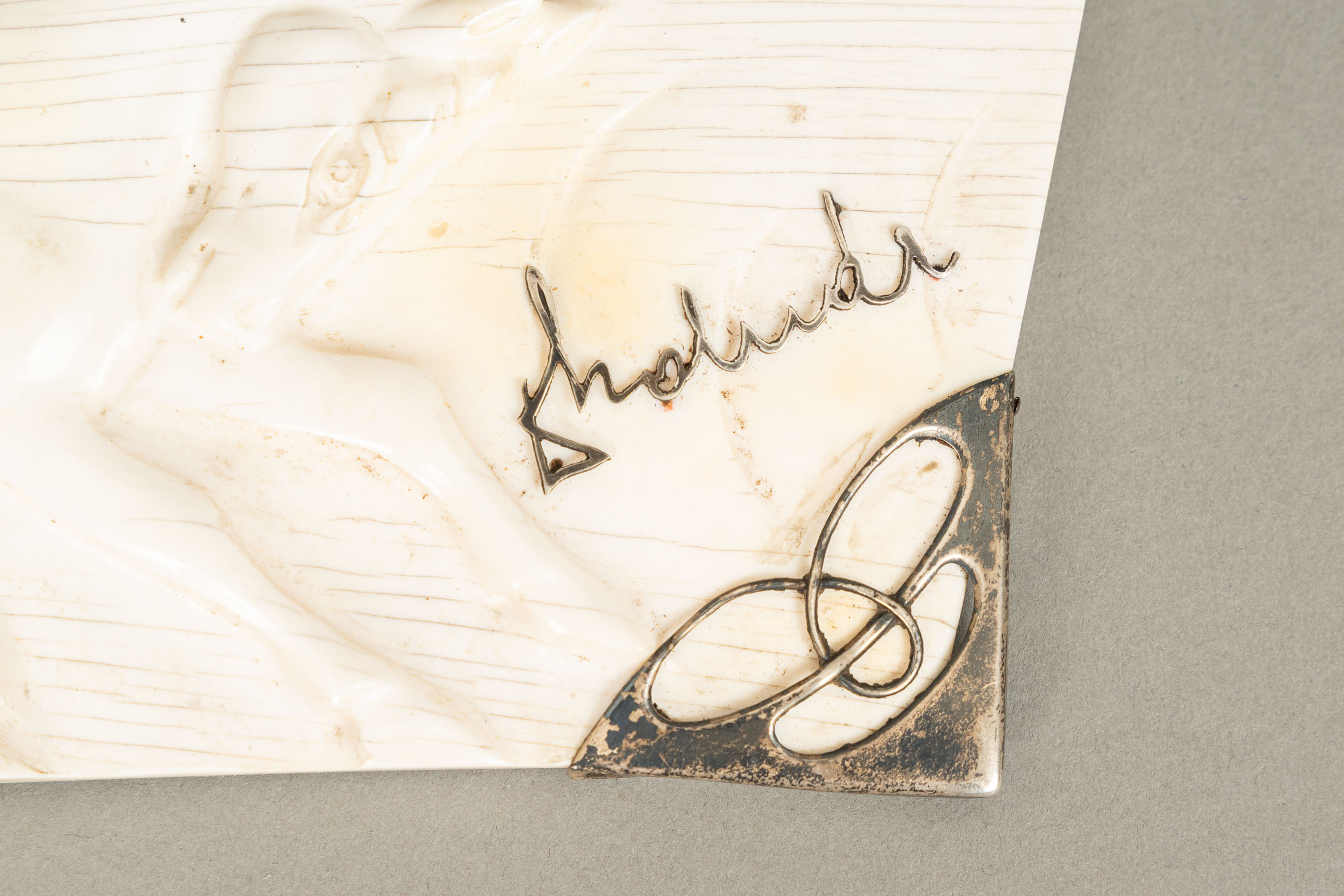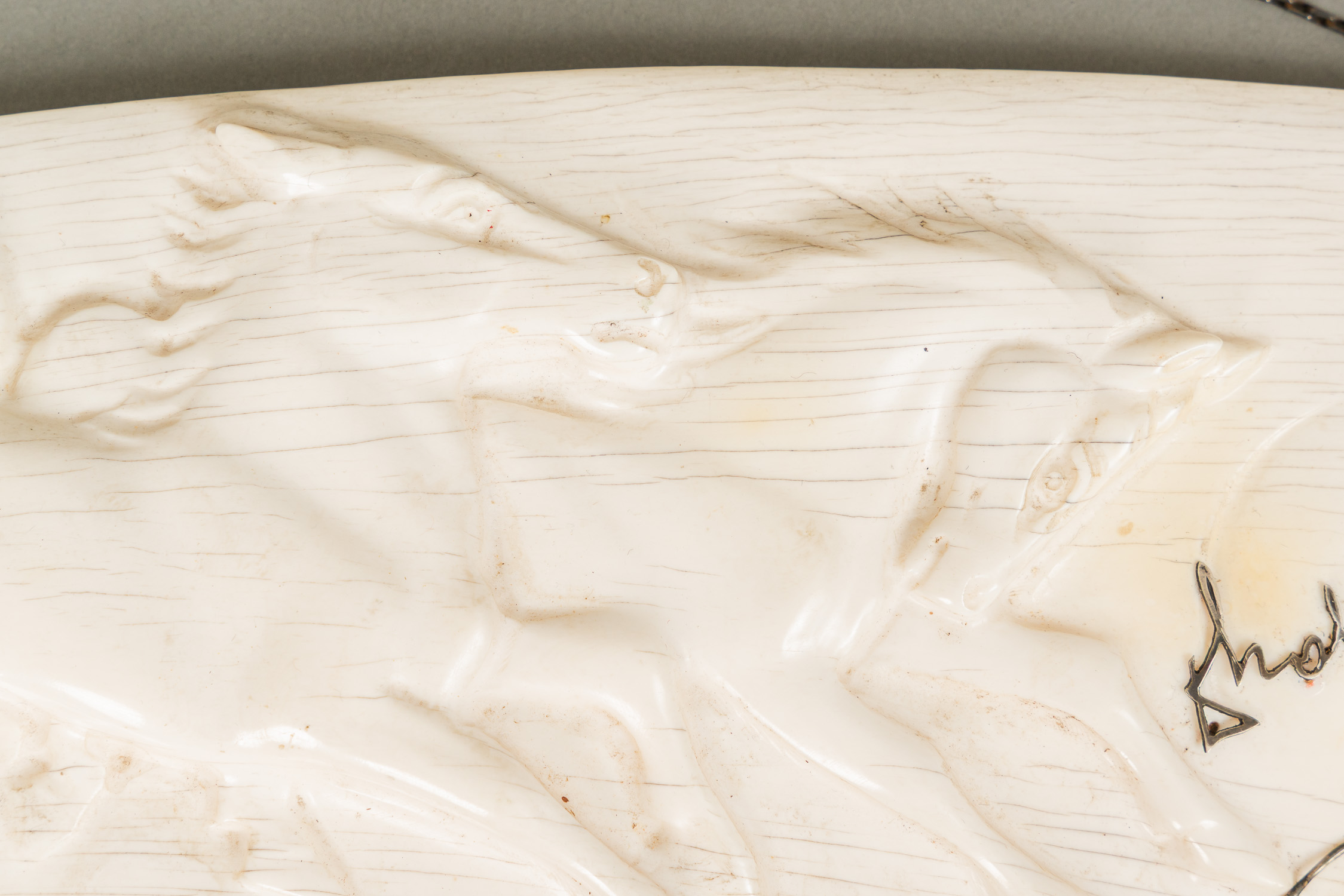 Horse Plinth, carved with two holes and chain on two sides mounted with silvered decorations and signature. Early 20th Century. 10 x 27 cm.