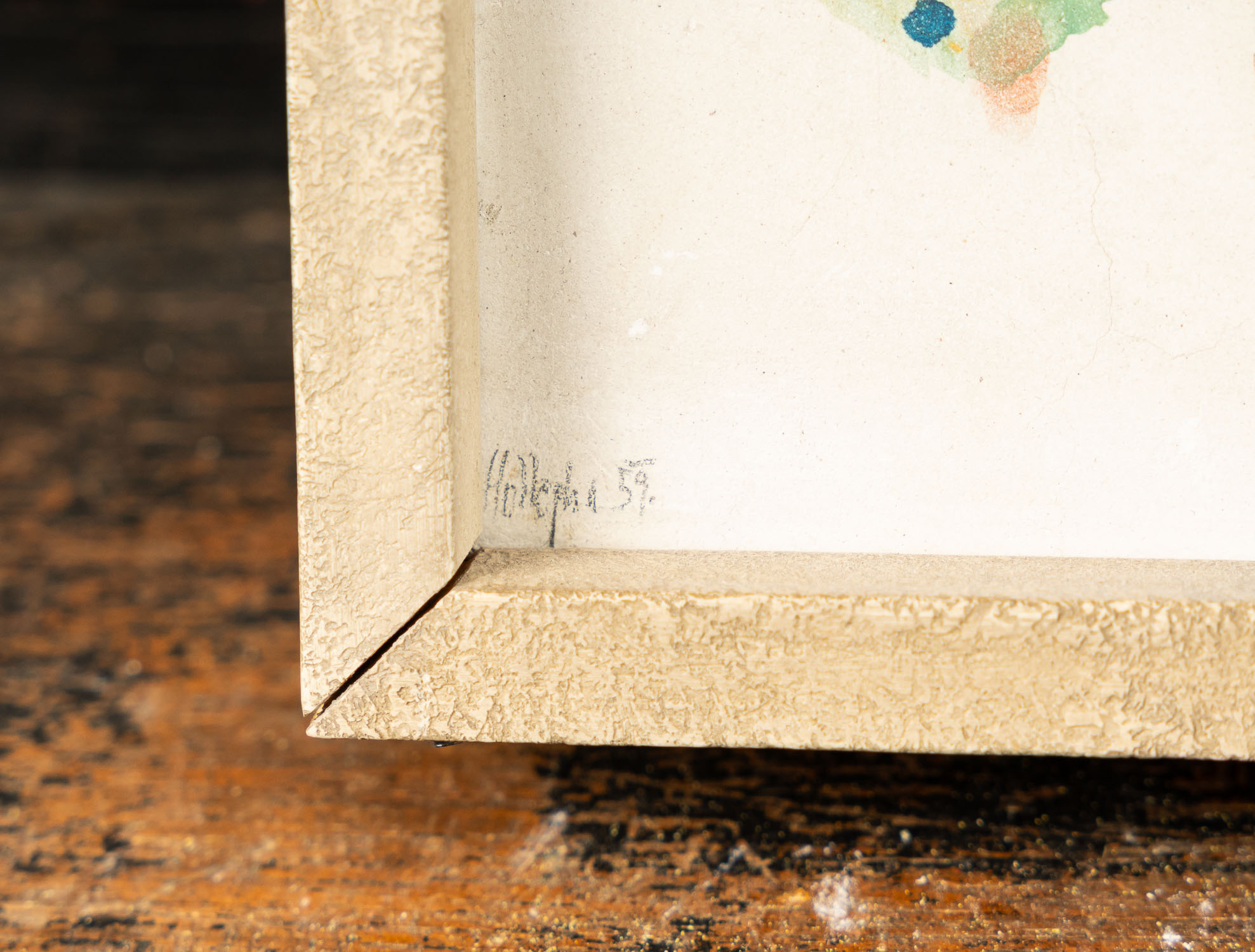 Wolfgang Hollegha (1929-2023), composition. Body colour on board. Signed bottom left and dated 1951 in original frame. On the reverse old number from exhibition of Museum of the 20Th Century and lable by Max Welz Galerie Vienna. 22 x 18 cm. The hammer price will go directly to the social help of the Caritas of Vienna, Provenance; estate found Erzdiozese Wien.
