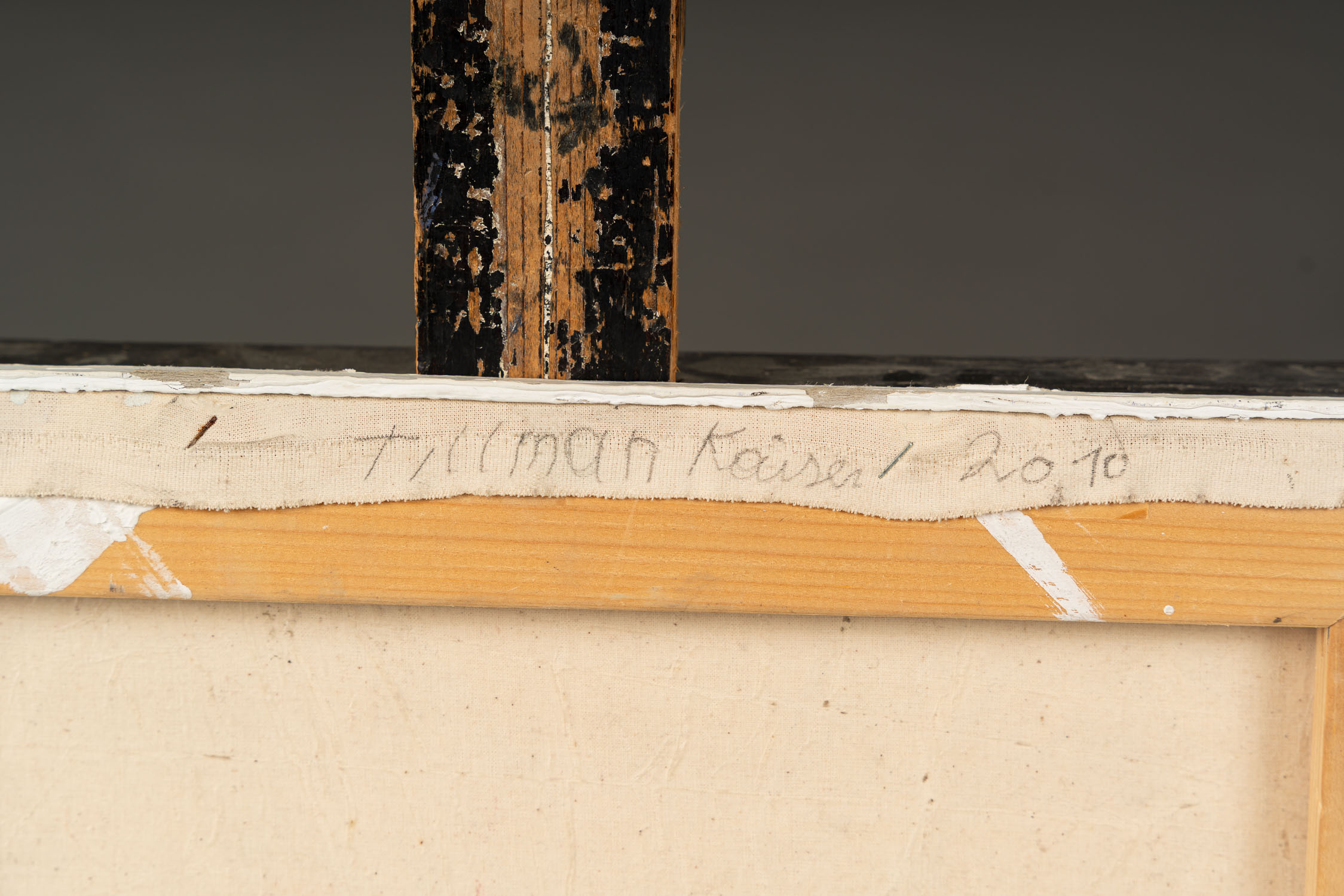 DEUTSCH AUCTIONEERS Lot299 in DetailTillman Kaiser (1972), geometric composition. Acryl colours and other techinques on canvas. Described on the reverse. Frame. 54 x 39 cm.