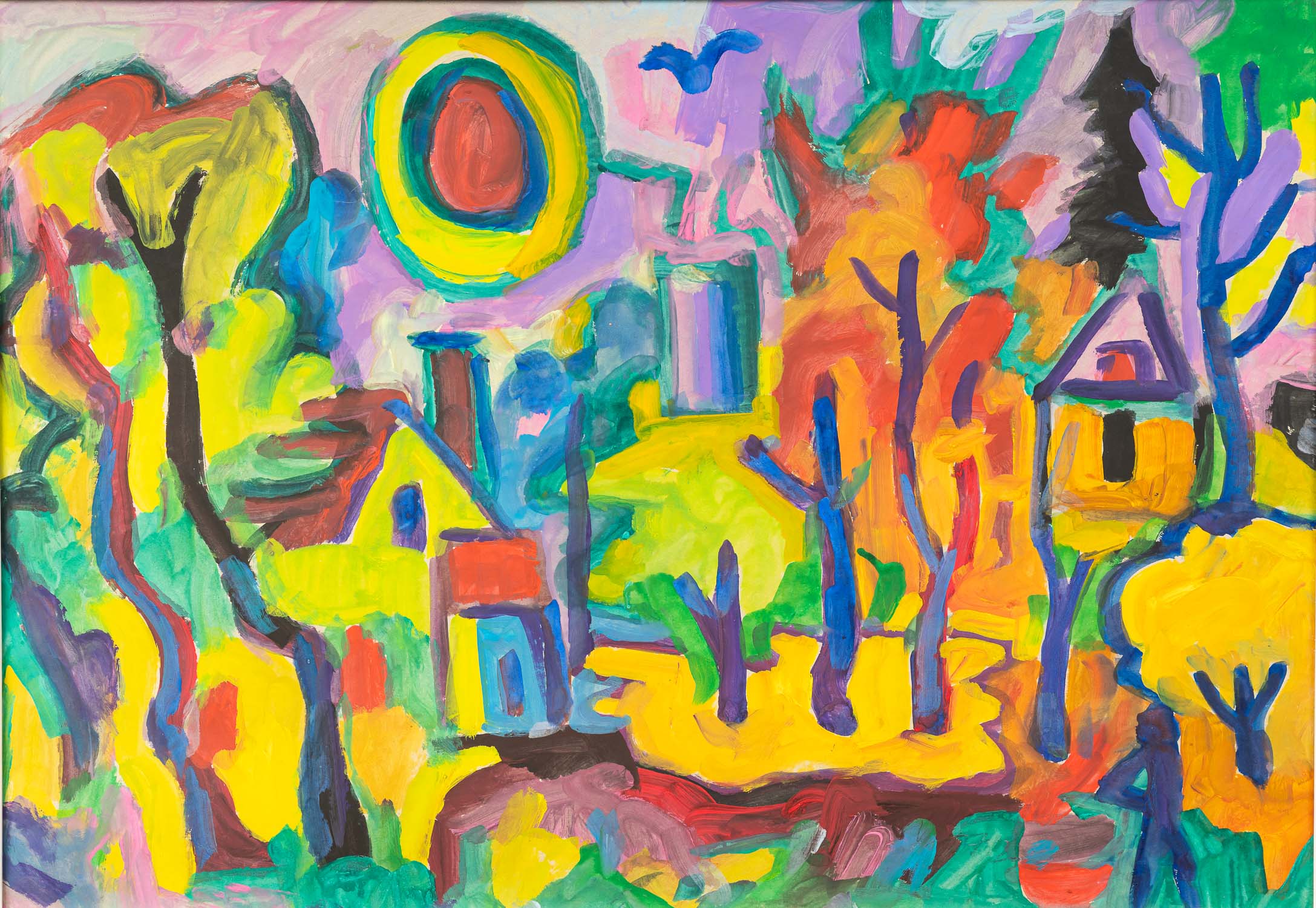 Miklos Nemeth (1934-2012), village. Acryl colours on paper. Framed. 72 x 100 cm.