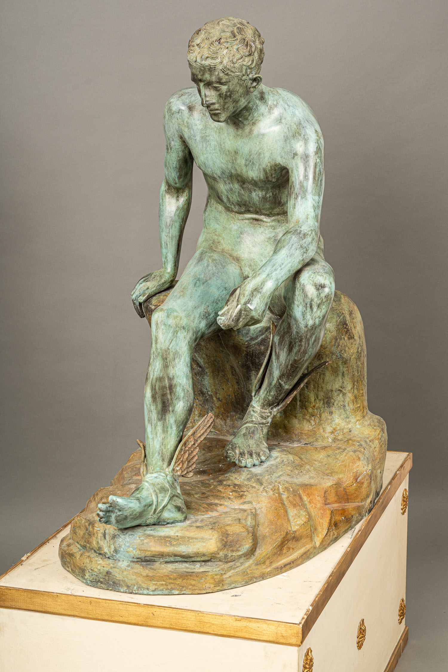 Hermes after the Ancient, sitting on a rock. Monumental bronze sculpture. Casted with original patina and verdi gris. On wooden partly gilded base. Signed and stamped Chiurazzi Napoli. With foundry mark. Around 1900. Total height 160 cm. Lenght 115 cm.