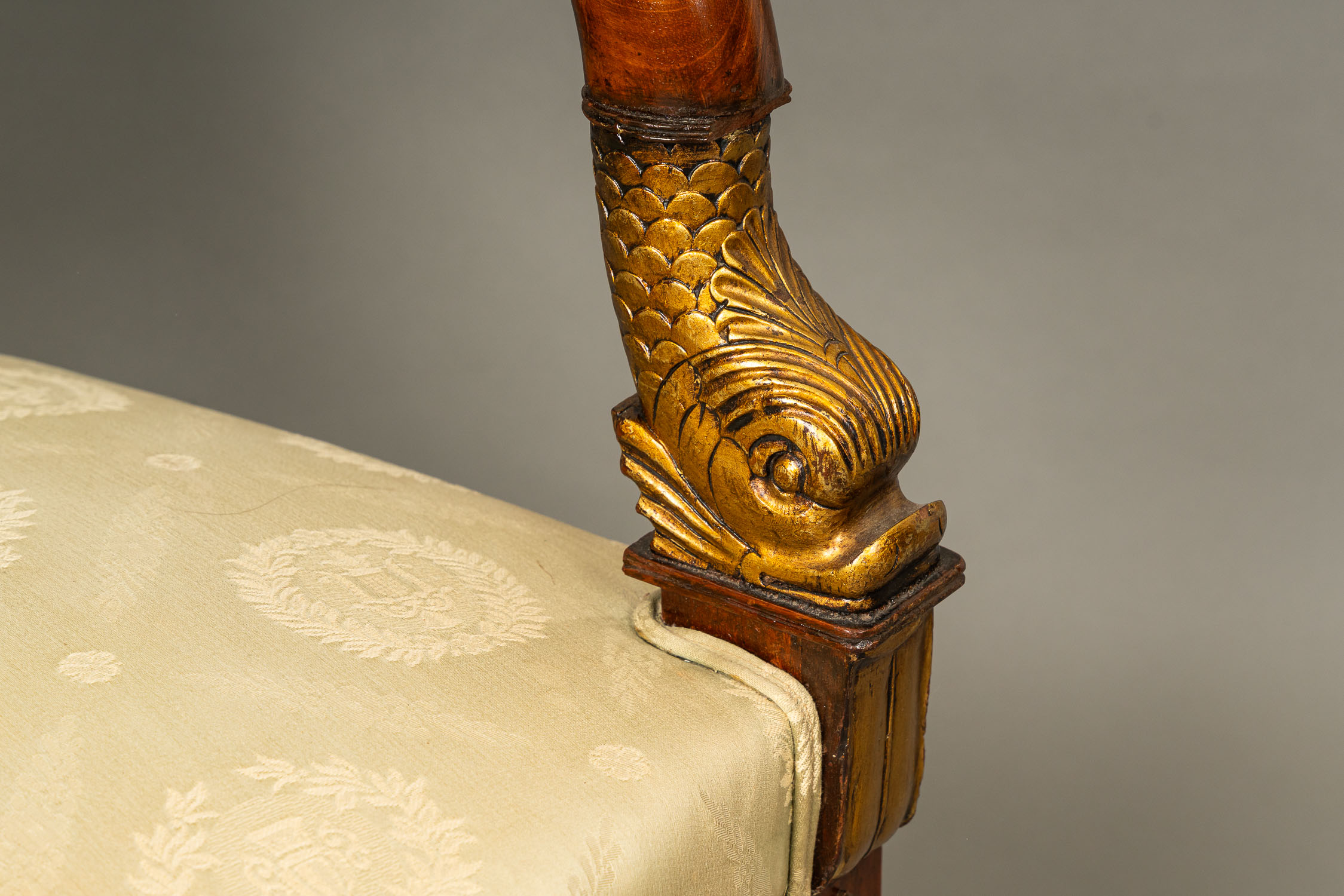 Pair of Classical Armchairs, in french empire character. Mahagony. Partly gilded and with gilded bronze mounts. Later green tapestry. A pair, 90,5 x 58 cm. Sitting high 40 cm. 19Th Century.
