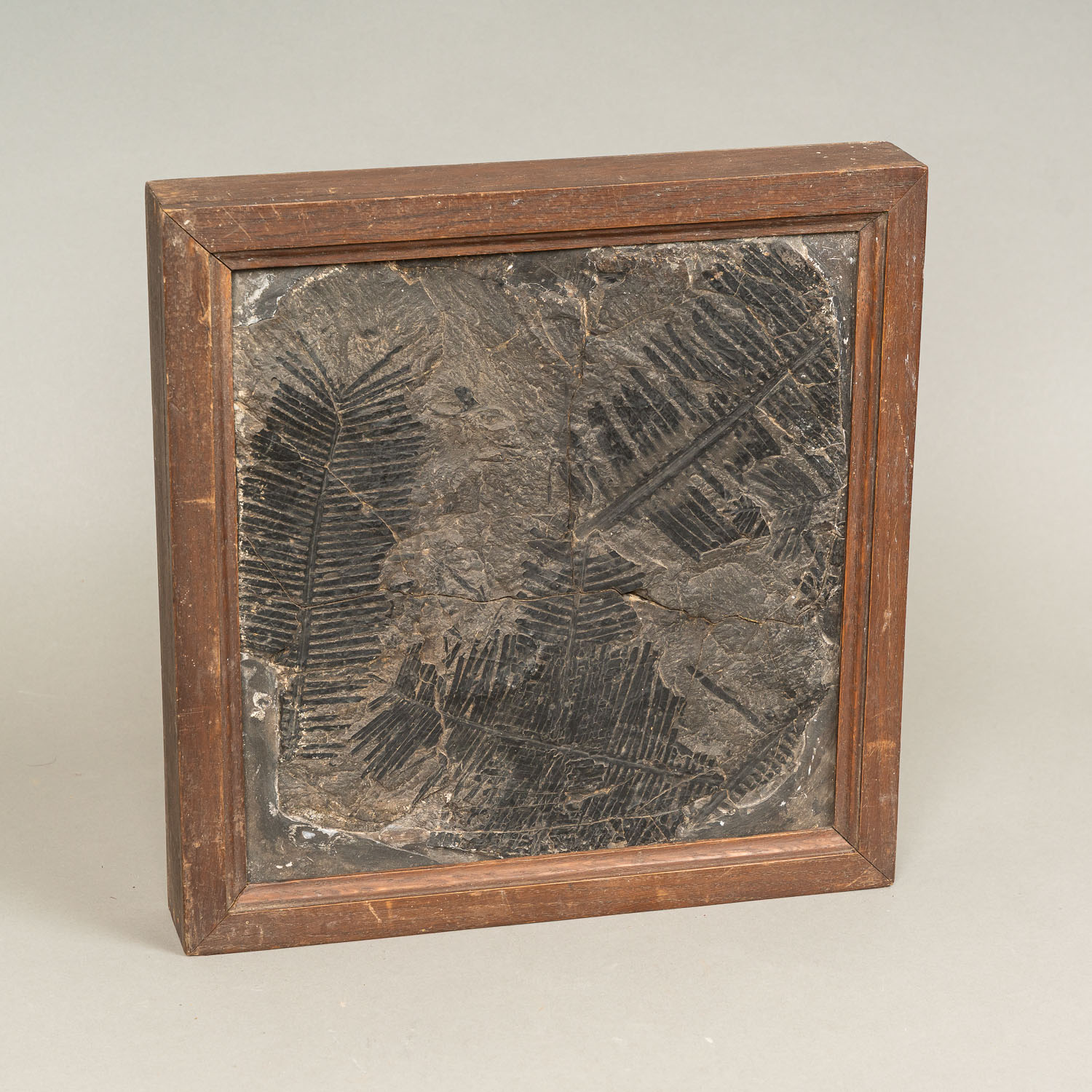 DEUTSCH AUCTIONEERS Lot004 in DetailLarge Fossil, black stone. Damages. In wooden frame. On the reverse old description. 34,5 x 34 cm.