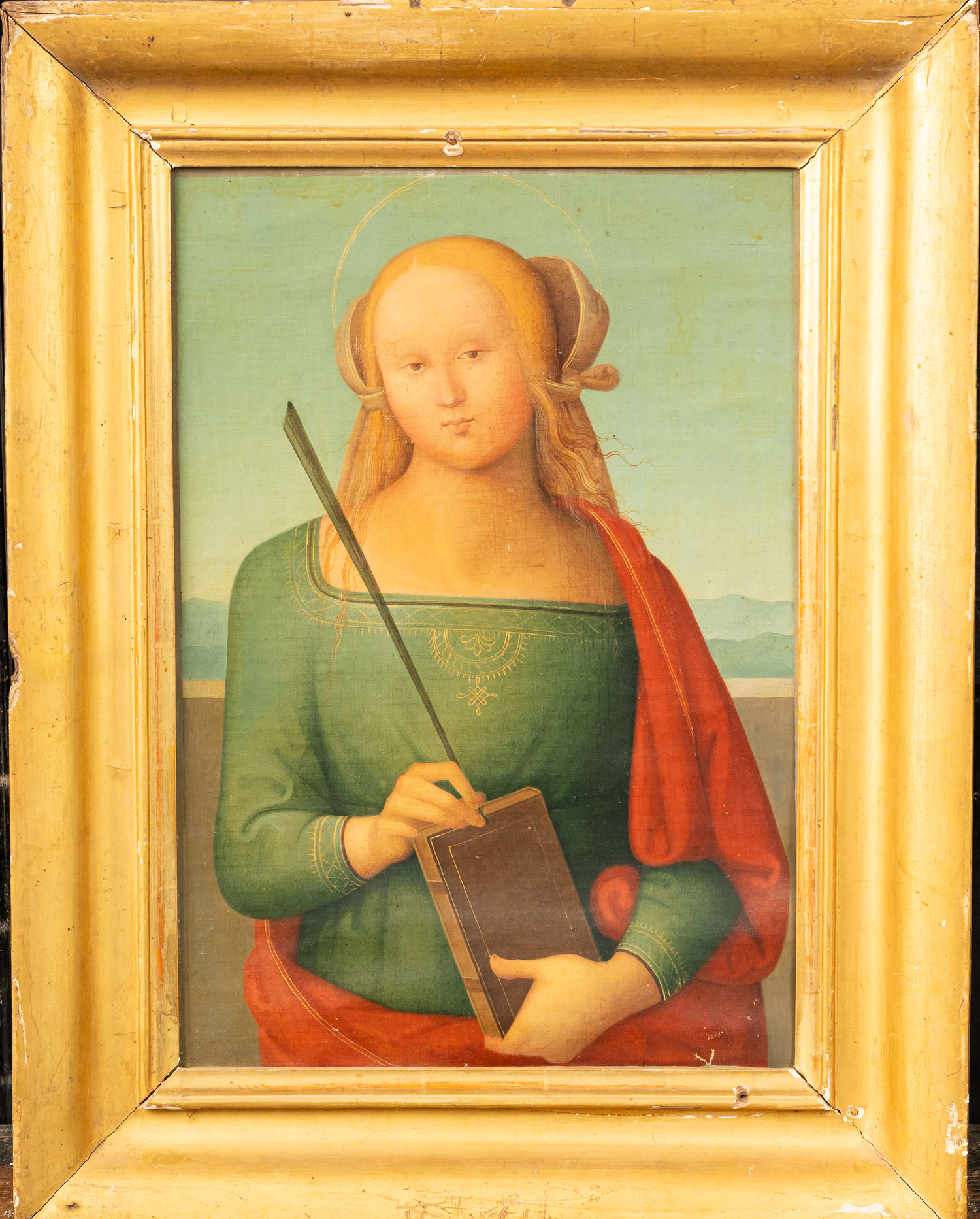DEUTSCH AUCTIONEERS Lot005 in DetailPietro Vannucci called Perugino ( 1446-1523)- taste of, Female Saint in landscape. Oil on textile on wood. Framed. 40 x 28 cm
