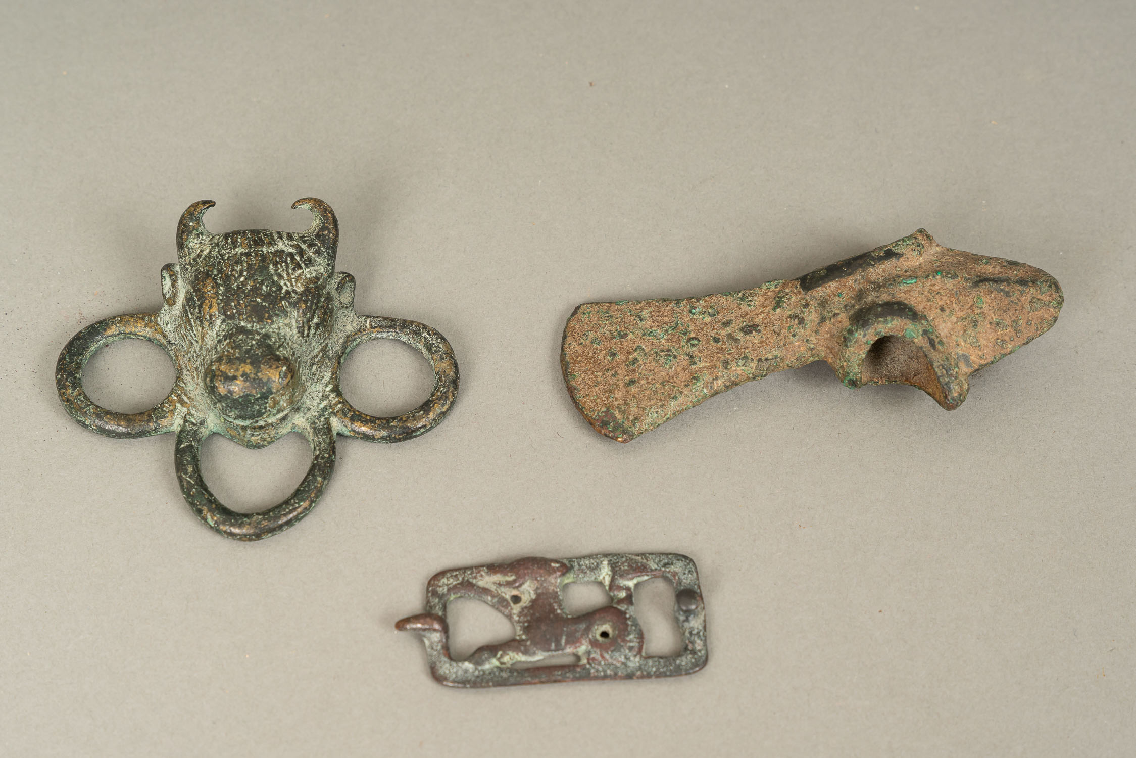 DEUTSCH AUCTIONEERS Lot006 in DetailCollection of three Ancient Items, bronze, different sizes, age and subjects. The hammer price will go directly to the social help of the Caritas of Vienna, Provenance; estate found Erzdiozese Wien.