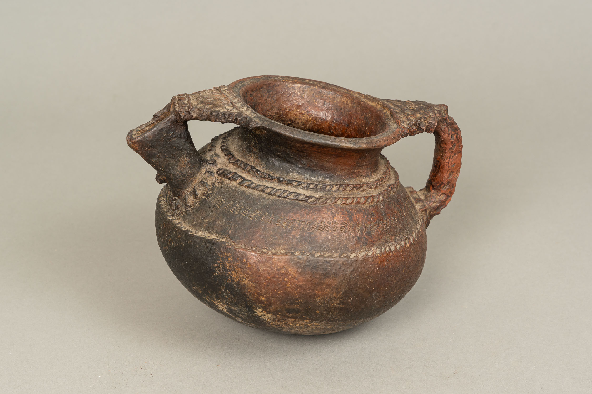 DEUTSCH AUCTIONEERS Lot008 in DetailAncient Ceramic Vessel, bowl shape with handgrip and spout. Decorations. Possibly black sea region. 15 x 22 cm.