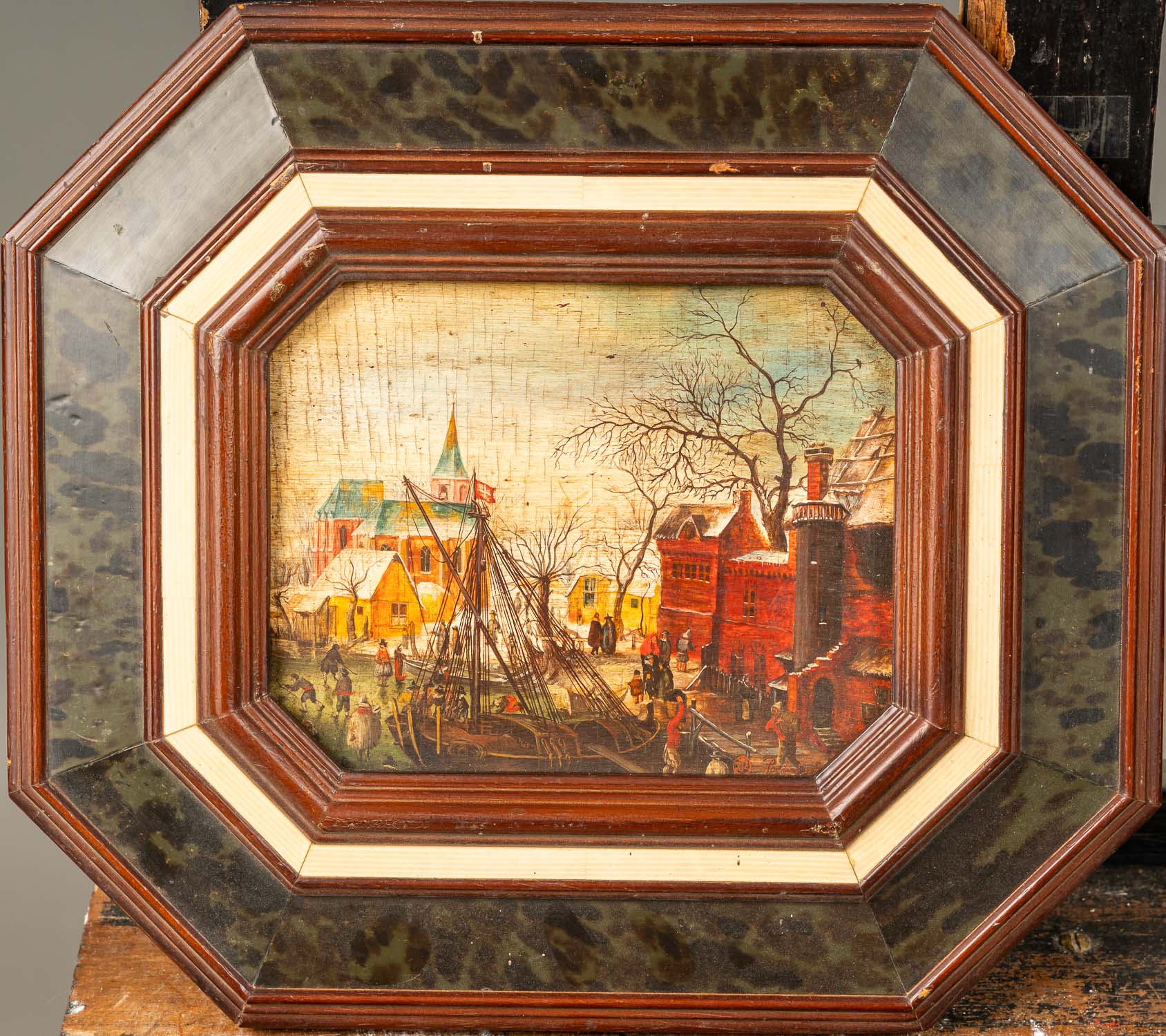 DEUTSCH AUCTIONEERS Lot009 in DetailHendrick Avercamp ( 1585-1634) – school, Village with boat , travellers and peasants in winter. Oil on wooden panel. In octagonal frame. 15 x 19 cm