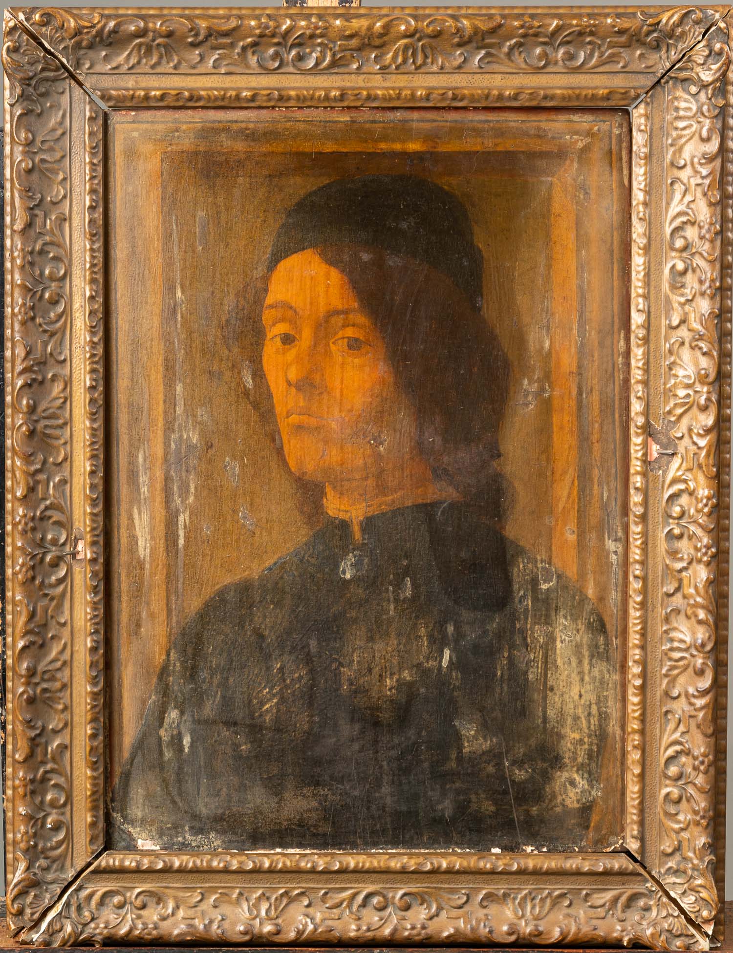 deuArt011Sandro Botticelli 445-1510)– - manner, Portrait of a young noble man , oil on wooden panel, damages. Frame not included. 55 x 39 cm