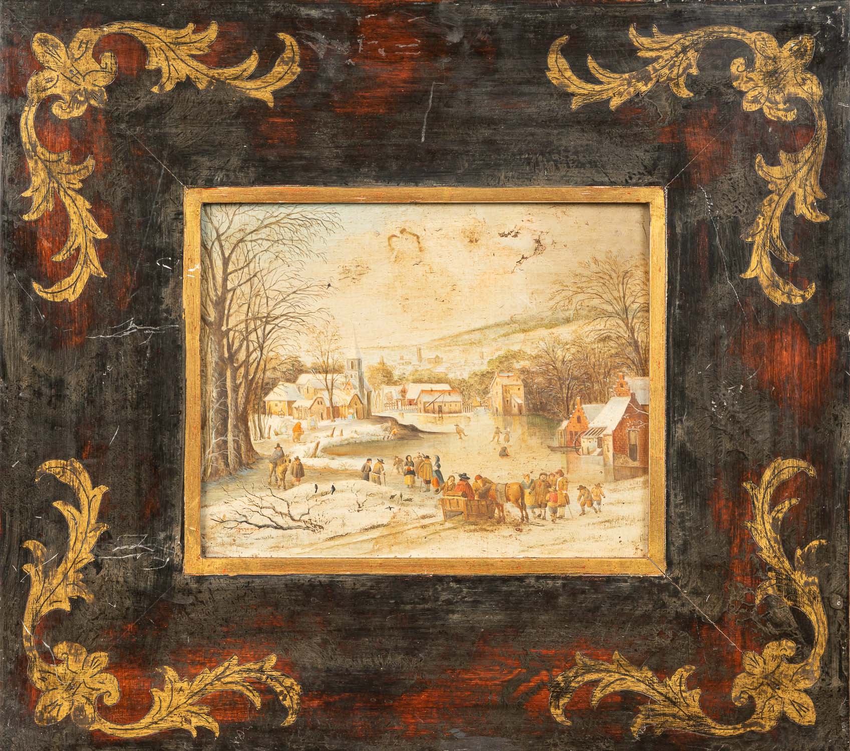 DEUTSCH AUCTIONEERS Lot015 in DetailJan Griffier ( 1652 – 1718 ) - follower, Winter landscape, village with farmers, oil on copper, framed. 23 x 29 cm