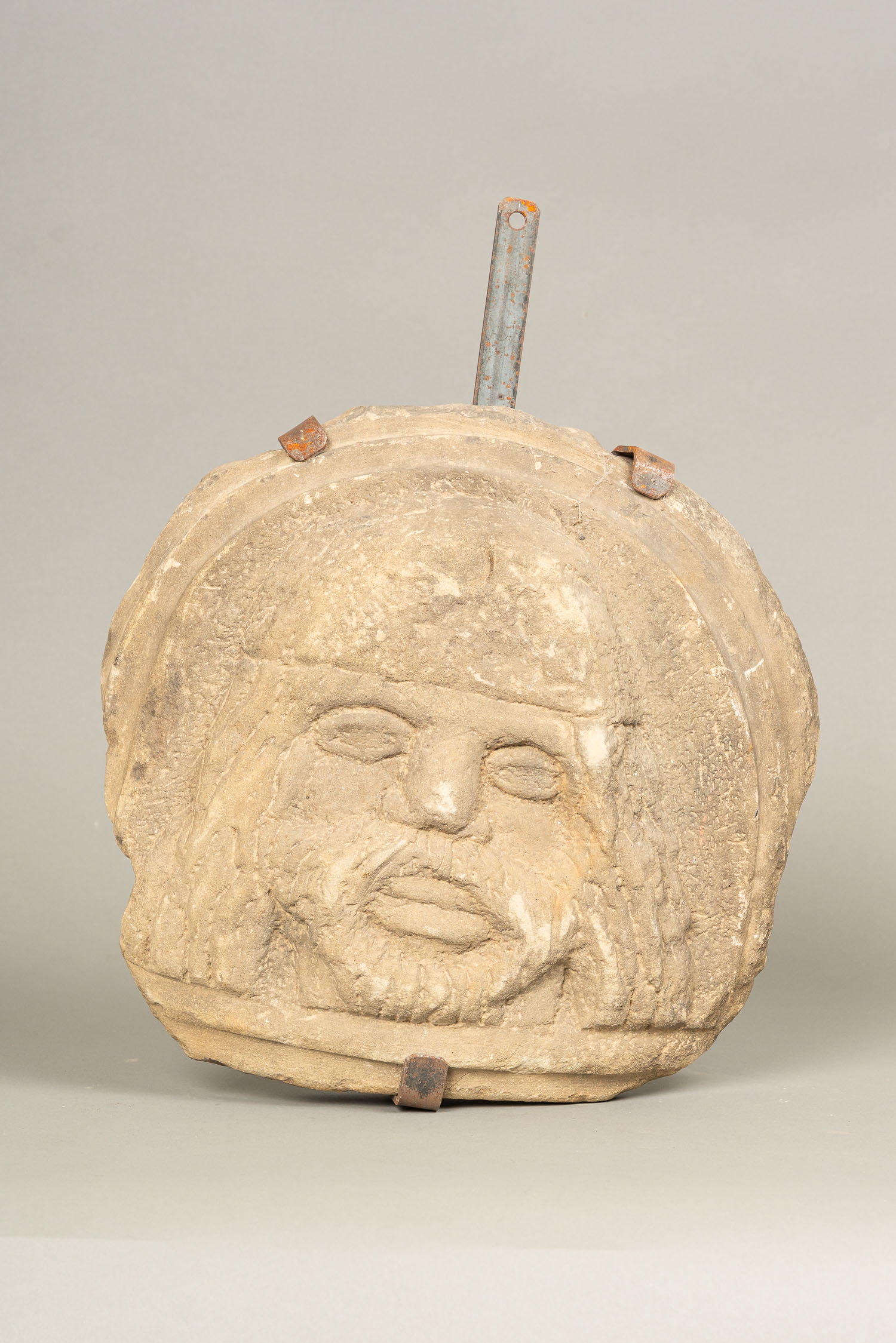 DEUTSCH AUCTIONEERS Lot019 in DetailMedieval Stone Plinth, portrait of a bearded man. Central Italian, 12/13th Century. On later iron mount. 34 x 34 cm.