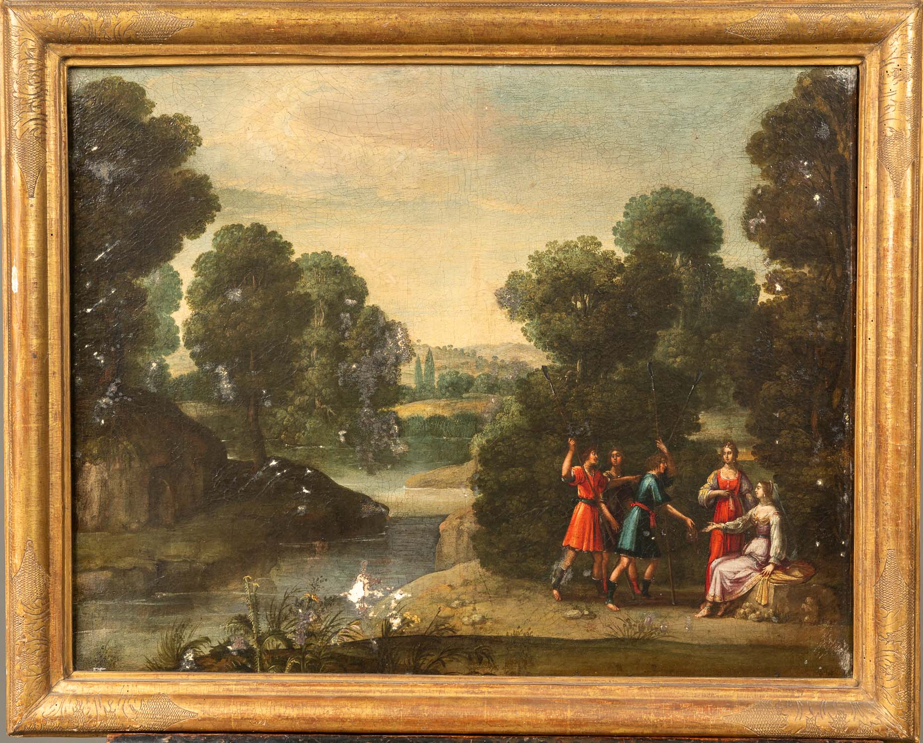 DEUTSCH AUCTIONEERS Lot020 in DetailPaul Bril (1554-1626)-circle, Alegorical scene with court ladys and three man in landscape. Oil on canvas. Framed. 50 x 62 cm