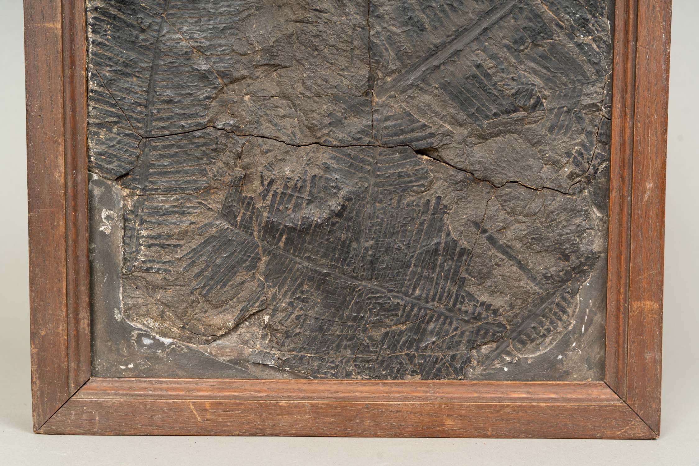 Large Fossil, black stone. Damages. In wooden frame. On the reverse old description. 34,5 x 34 cm.
