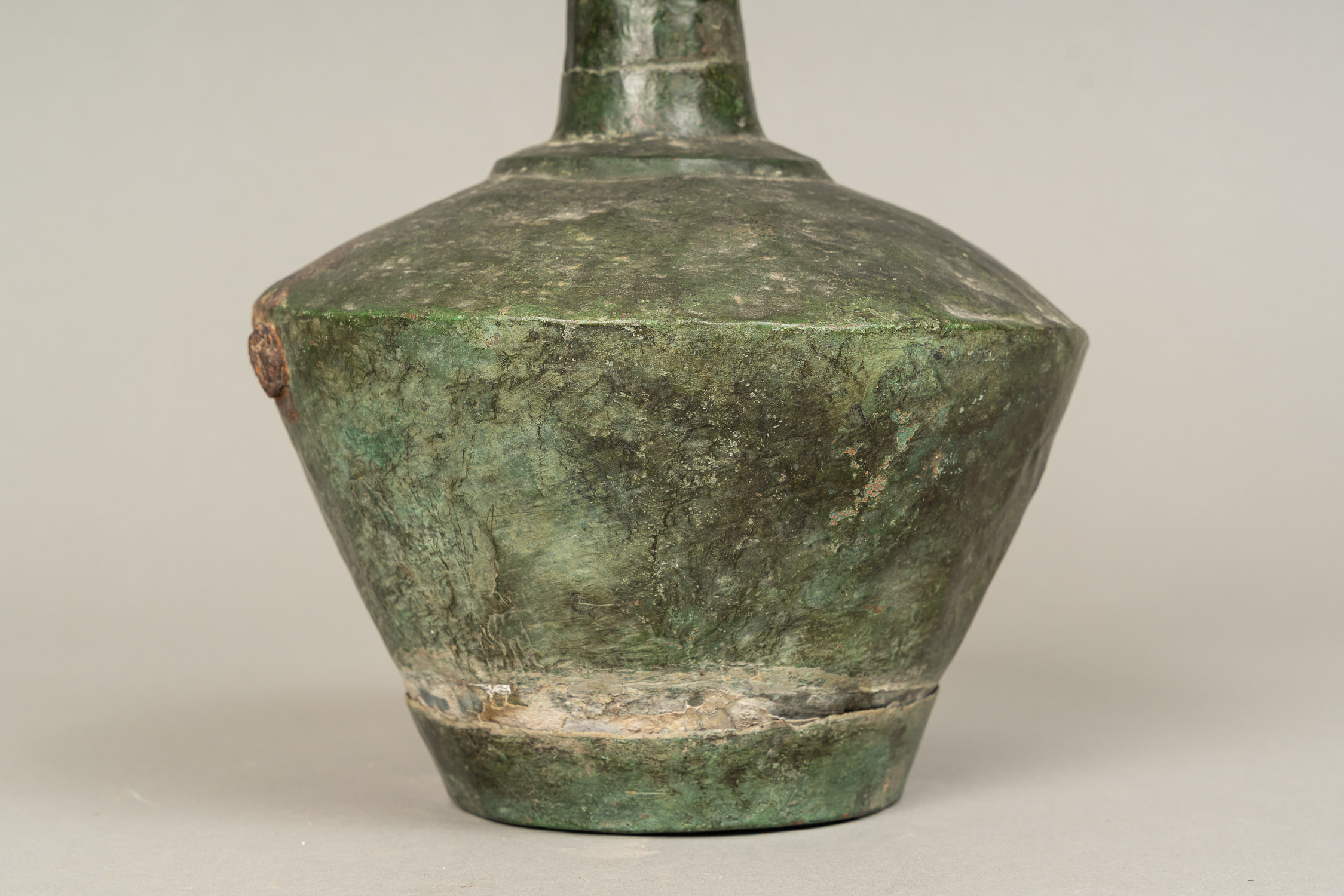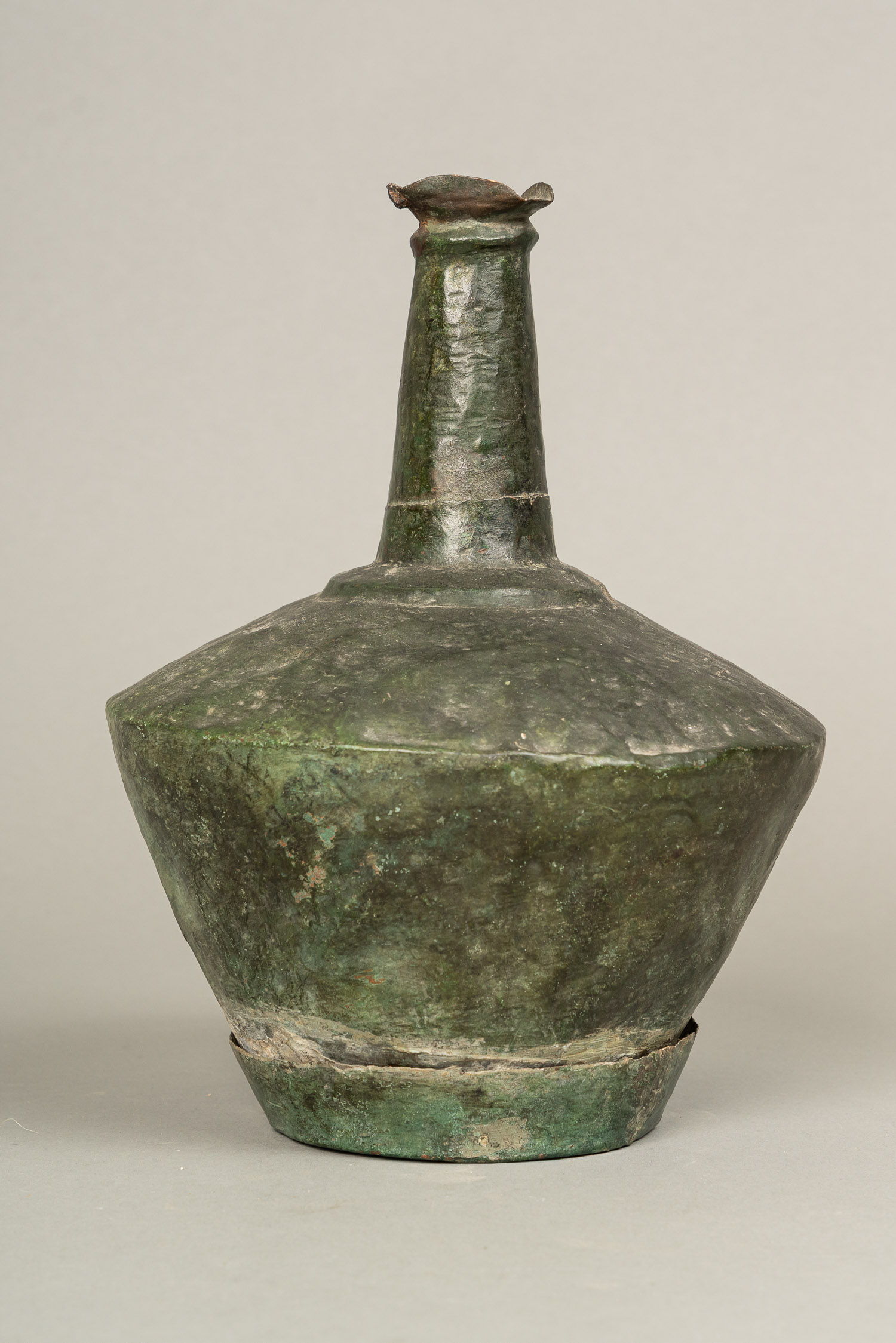 Ancient Copper Flask, with long neck. Canted and rounded body. Lower separate part. Verdi gris. Damages, probably greek , Black Sea region ,