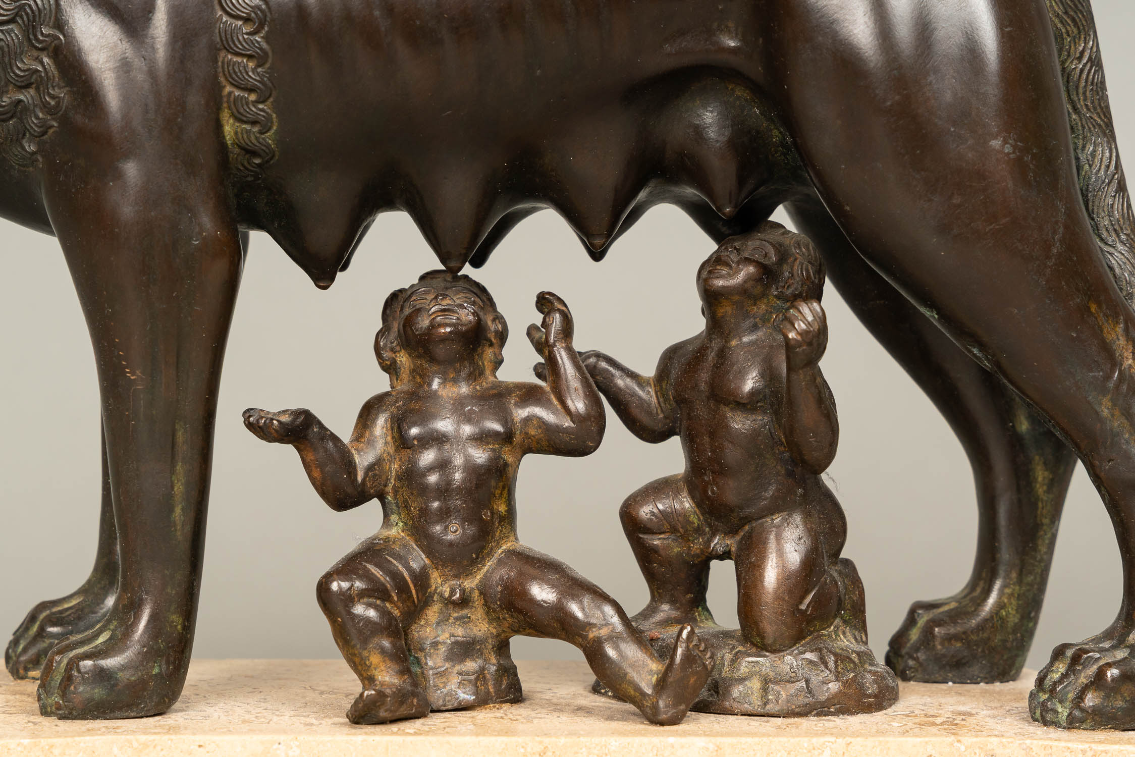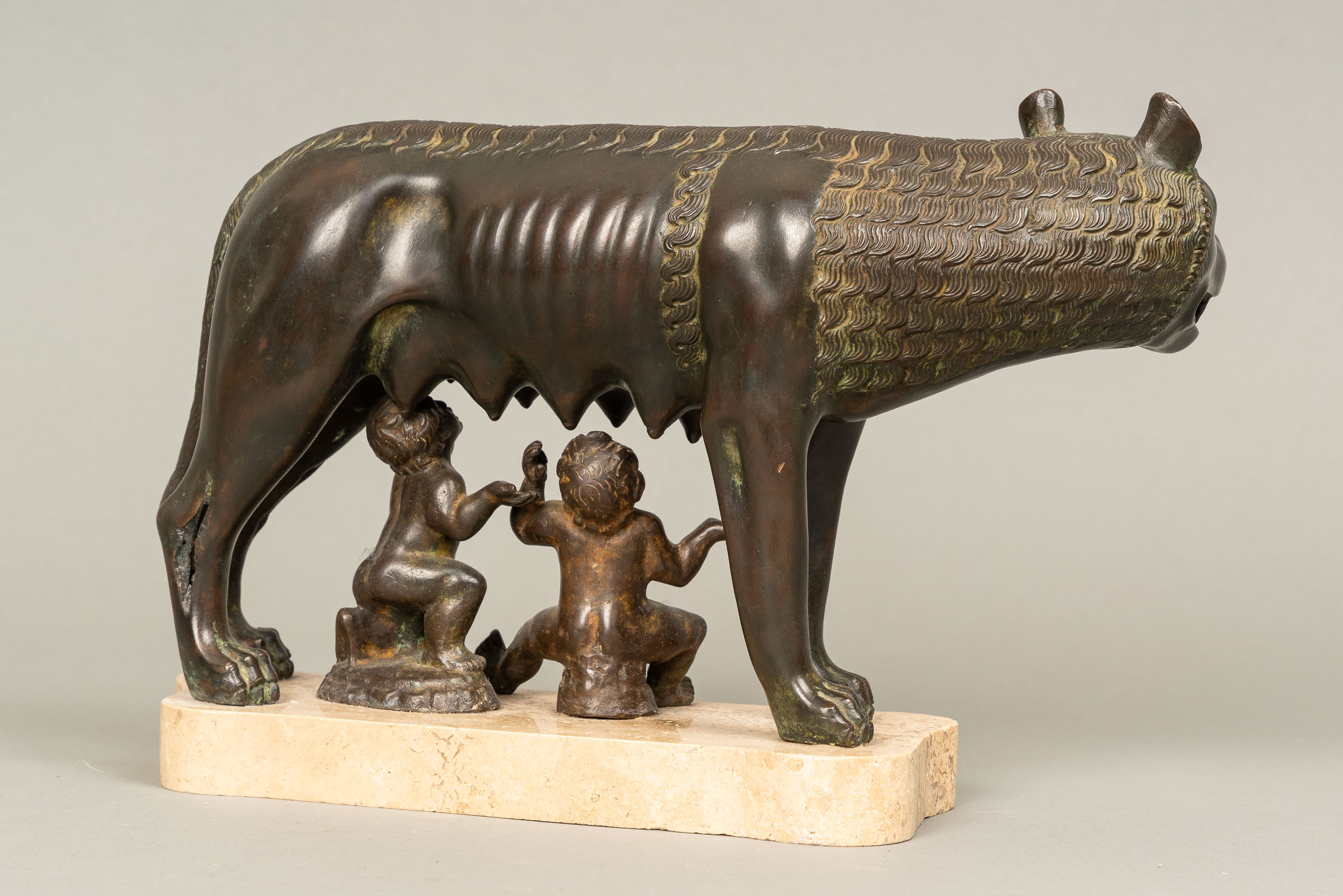 Lupa Romana, bronze cast with original patina. On marble plinth. Late 19th Century. 21 x 32 cm.