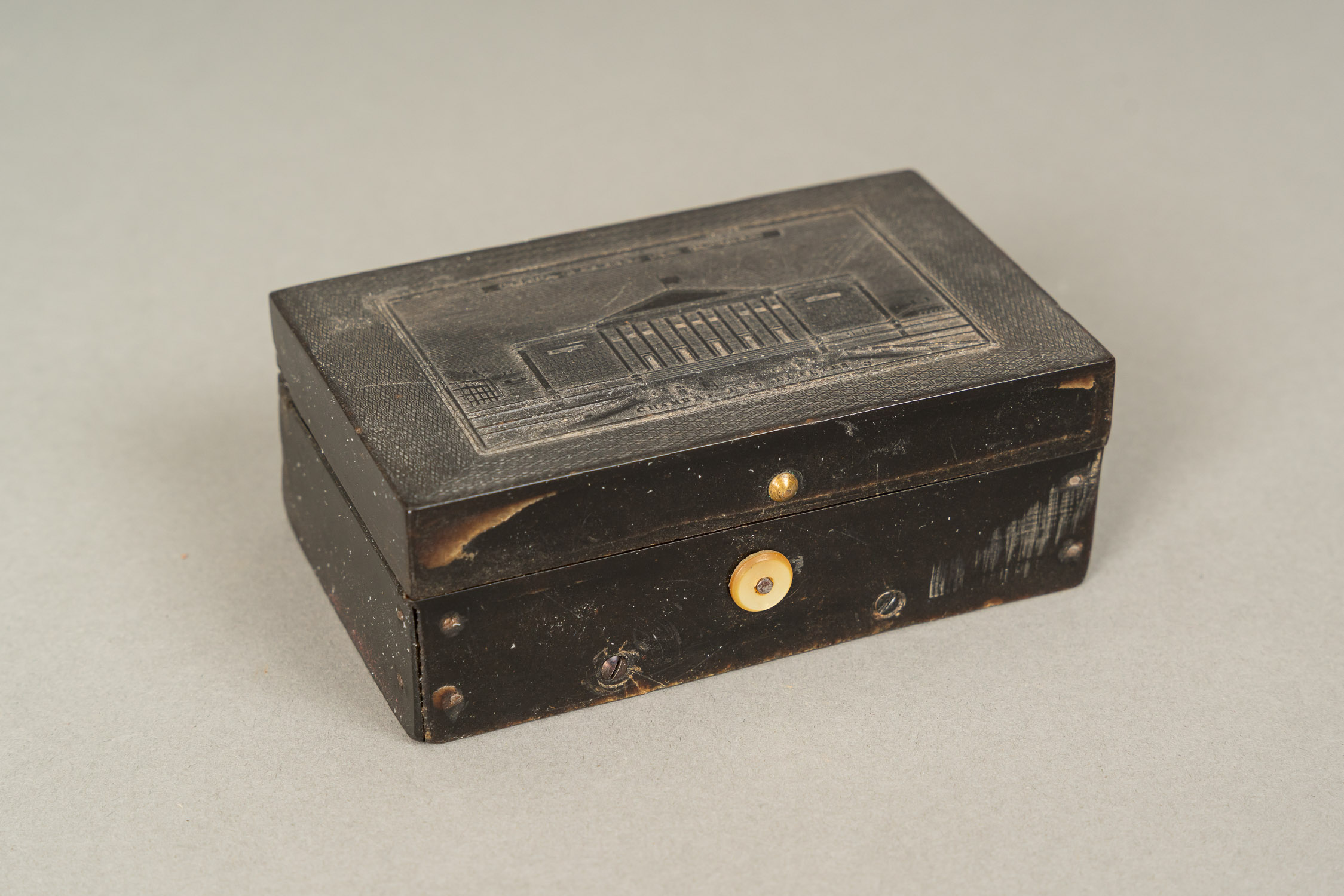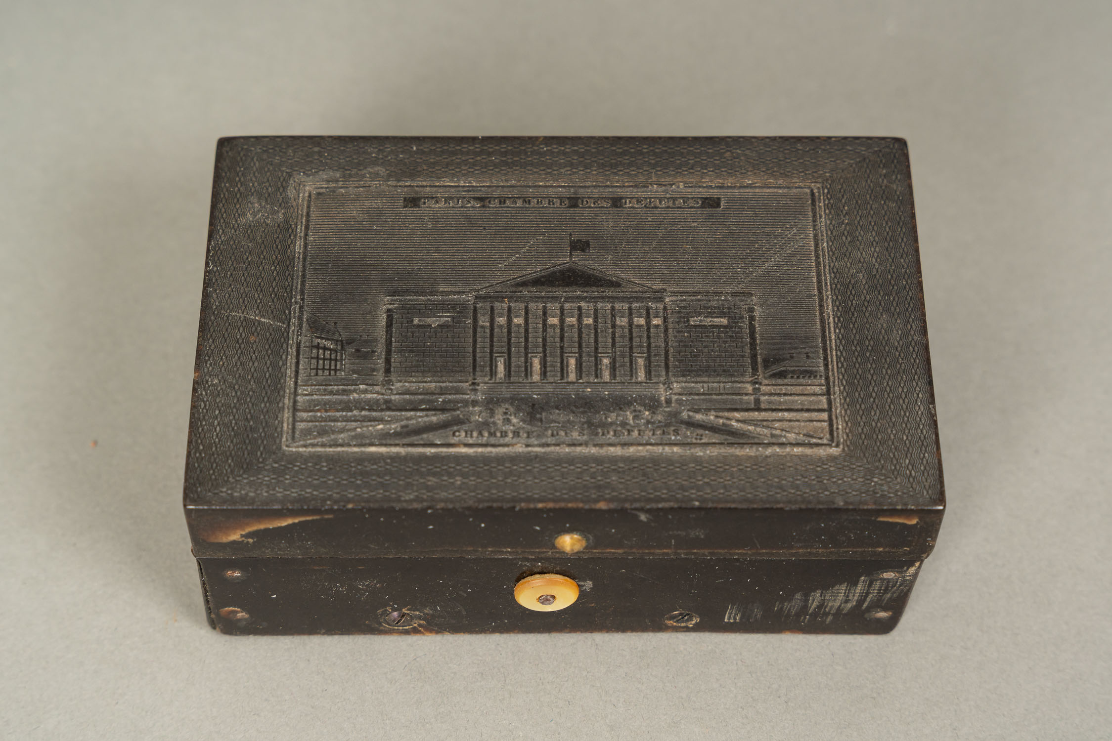 Swiss Music Box, rectangluar shape. Original movement by J. H. Heller in Bern with paper label playing three songs: Annee Laurie, Nelly Bly and Home sweet home. With windup hole and stop button. Key missing. Black box with on top the Chambre des Deputees, Paris. First half 19th Century. 11 x 6,7 x 3,8 cm.