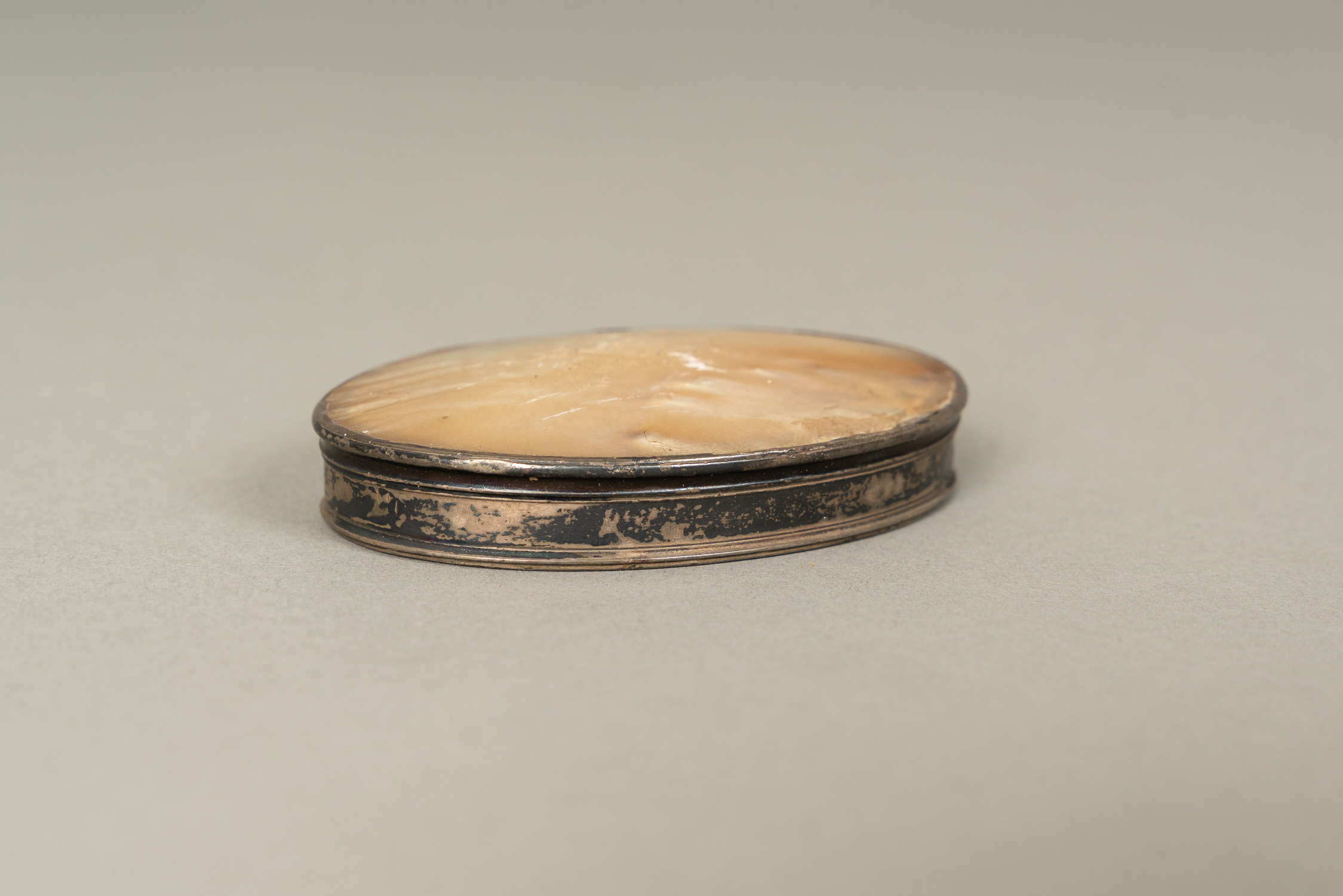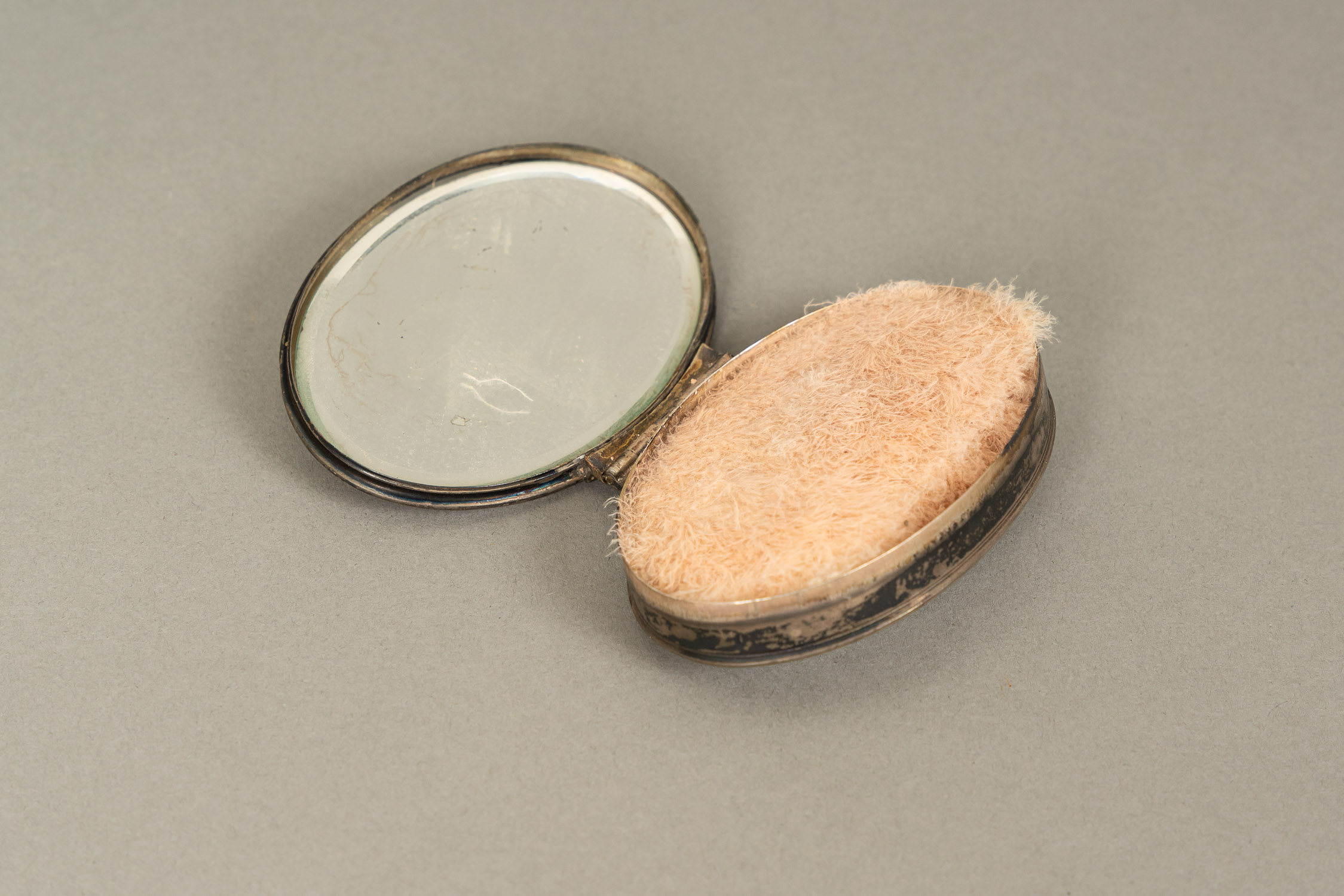Powder Box, oval. With lid. Silver. Inside mirror and textile. Mother of pearl top and bottom. Damages, 19th Century. 71 gramm. 8 x 5,7 x 1,5 cm.