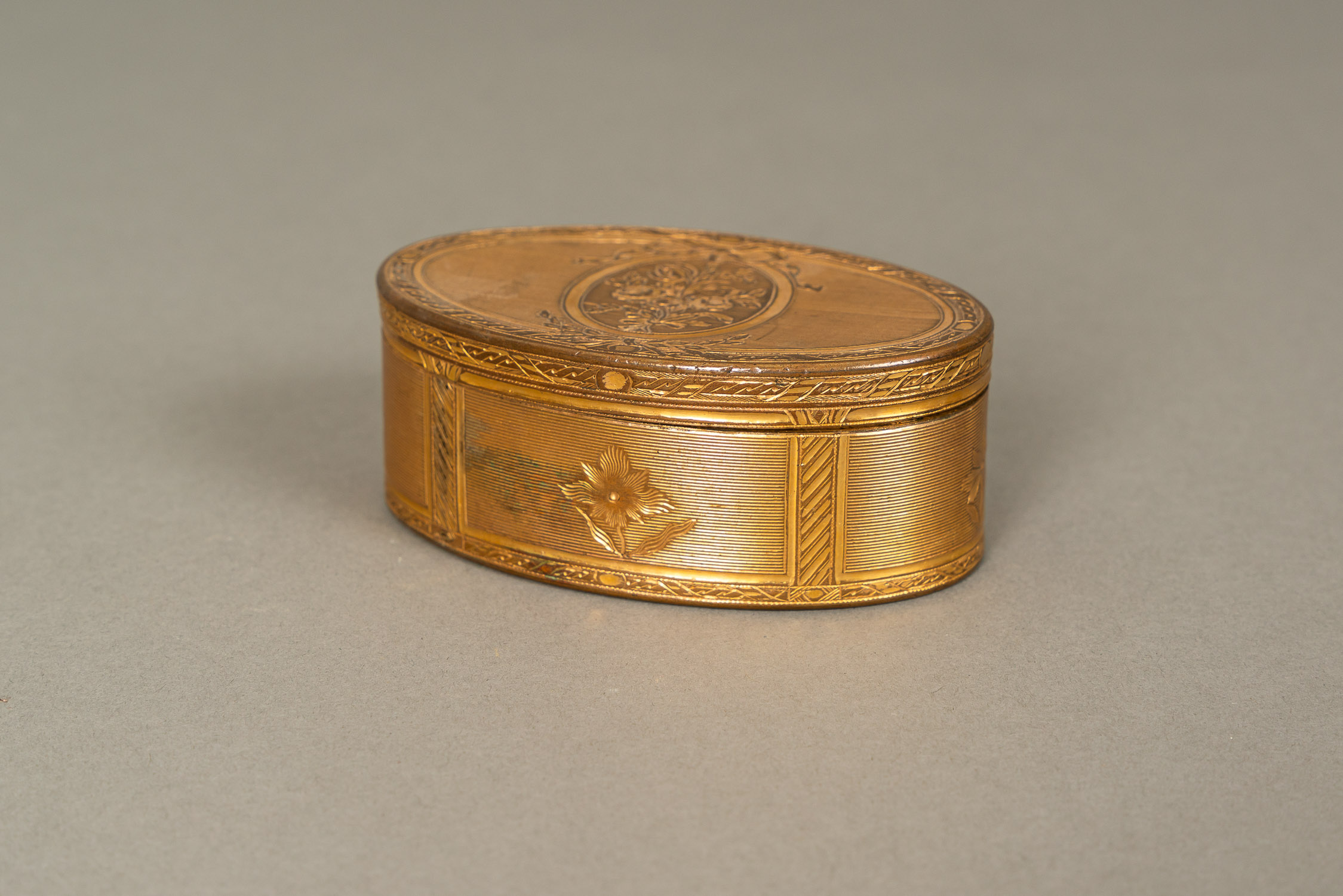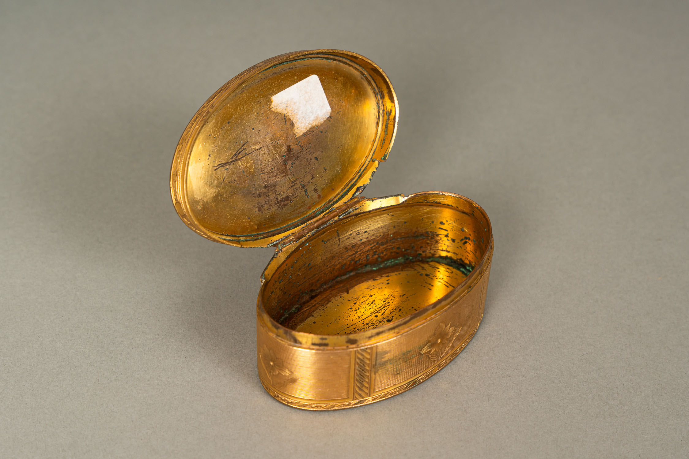 Snuff Box, oval shape with lid. Rich floral ornamental engravings. Copper work gilded. French around 1770. 8,5 x 5,3 x 3,4 cm.