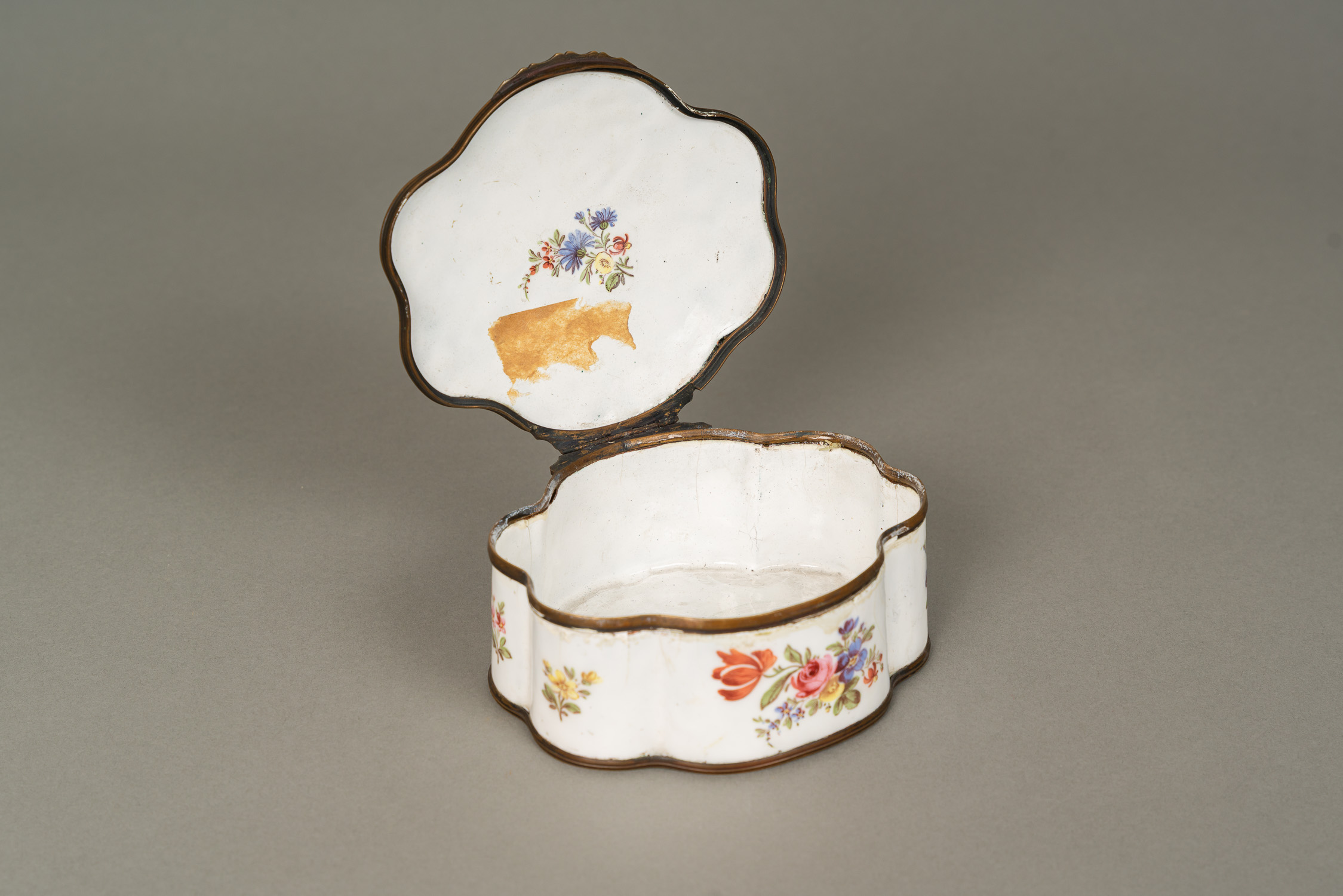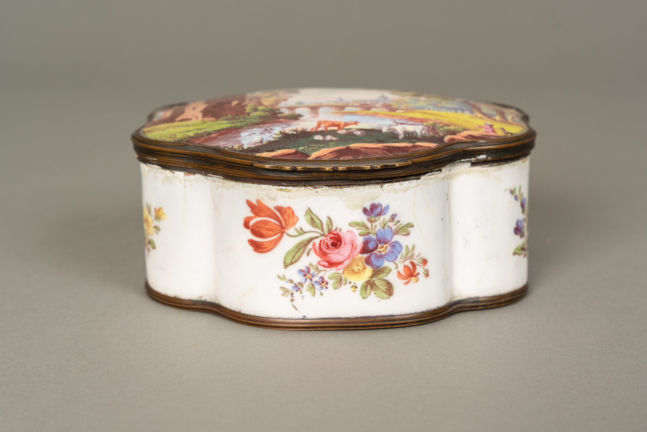Snuff Box, cartouche shape with lid. Copperwork to be opened with painted enamel landscape and flowers. German 18th Century. 14 x 12 x 6,5 cm.