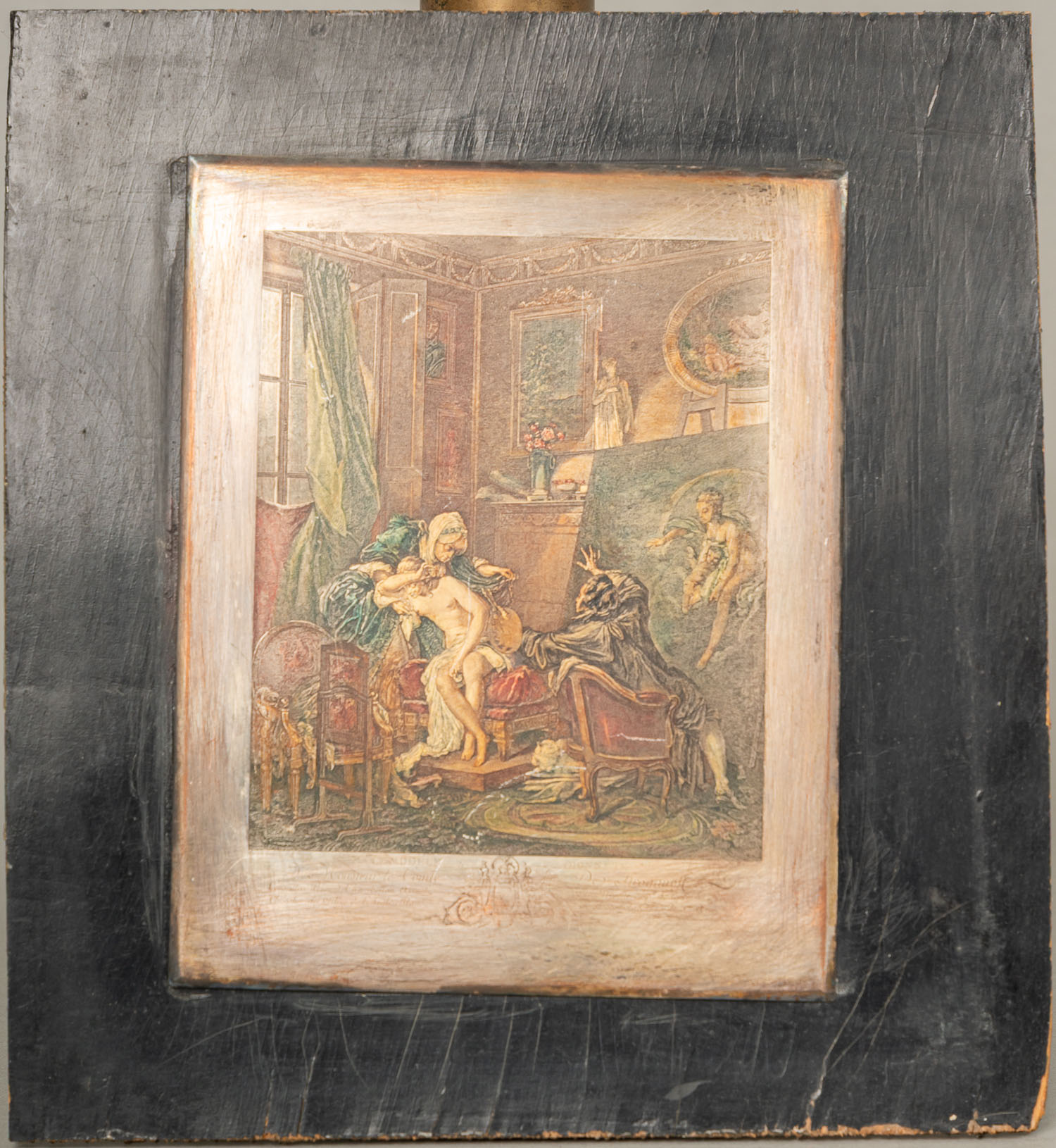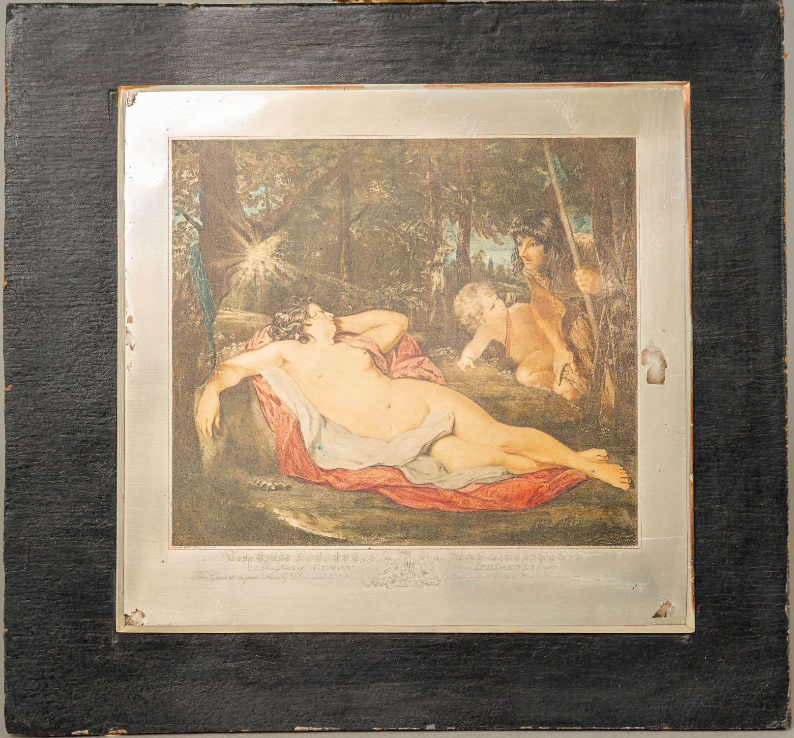 Two Print Plates, metal described on ebonized wooden panels. 19Th Century. 22 x 23 cm and 22 x 20 cm.