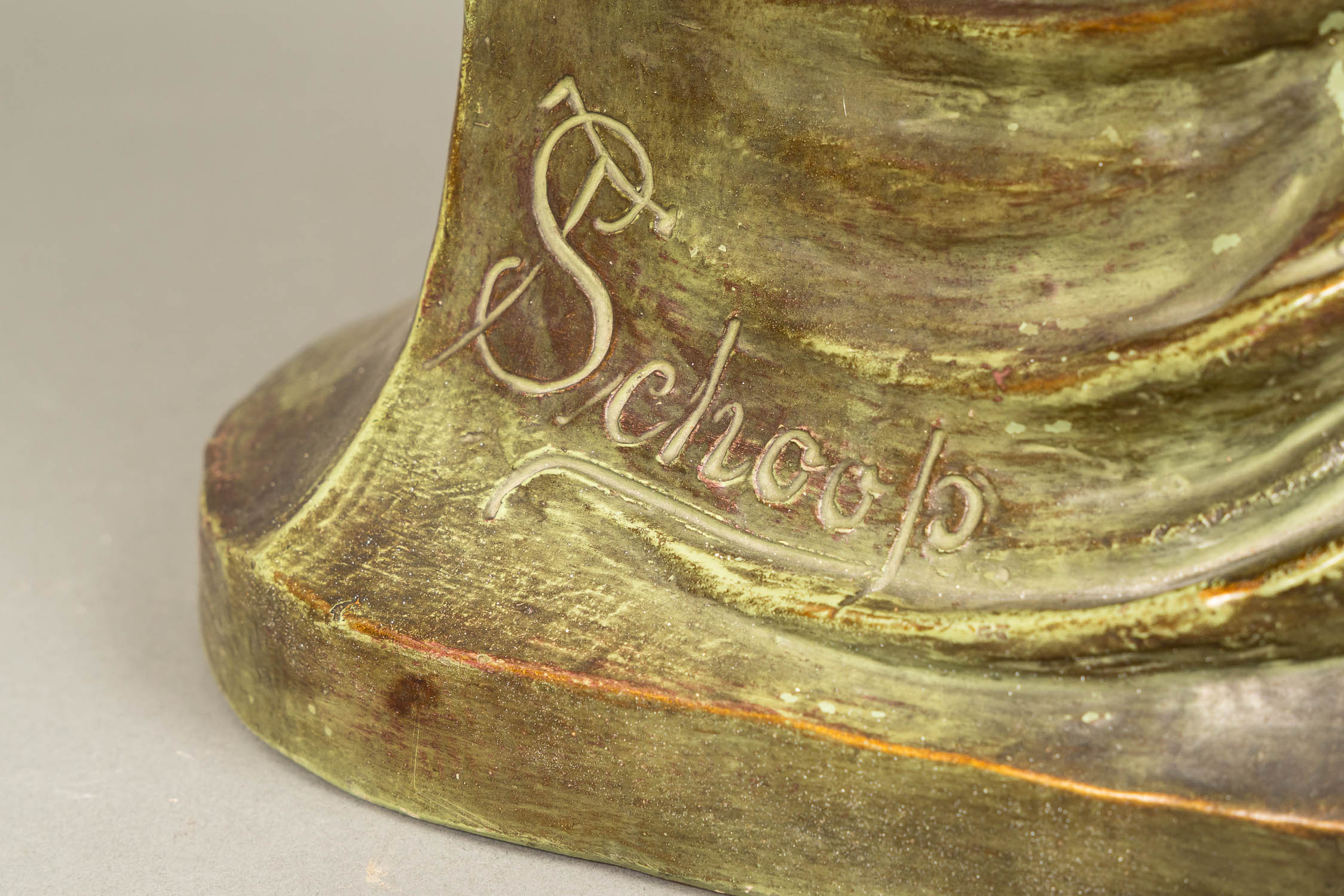 Theodor Schoop around 1900, la Gaiete. Ceramic sculpture, possibly manufactured by Bernhard Bloch. Signed Schoop. Original green brown patina. 65 cm high.