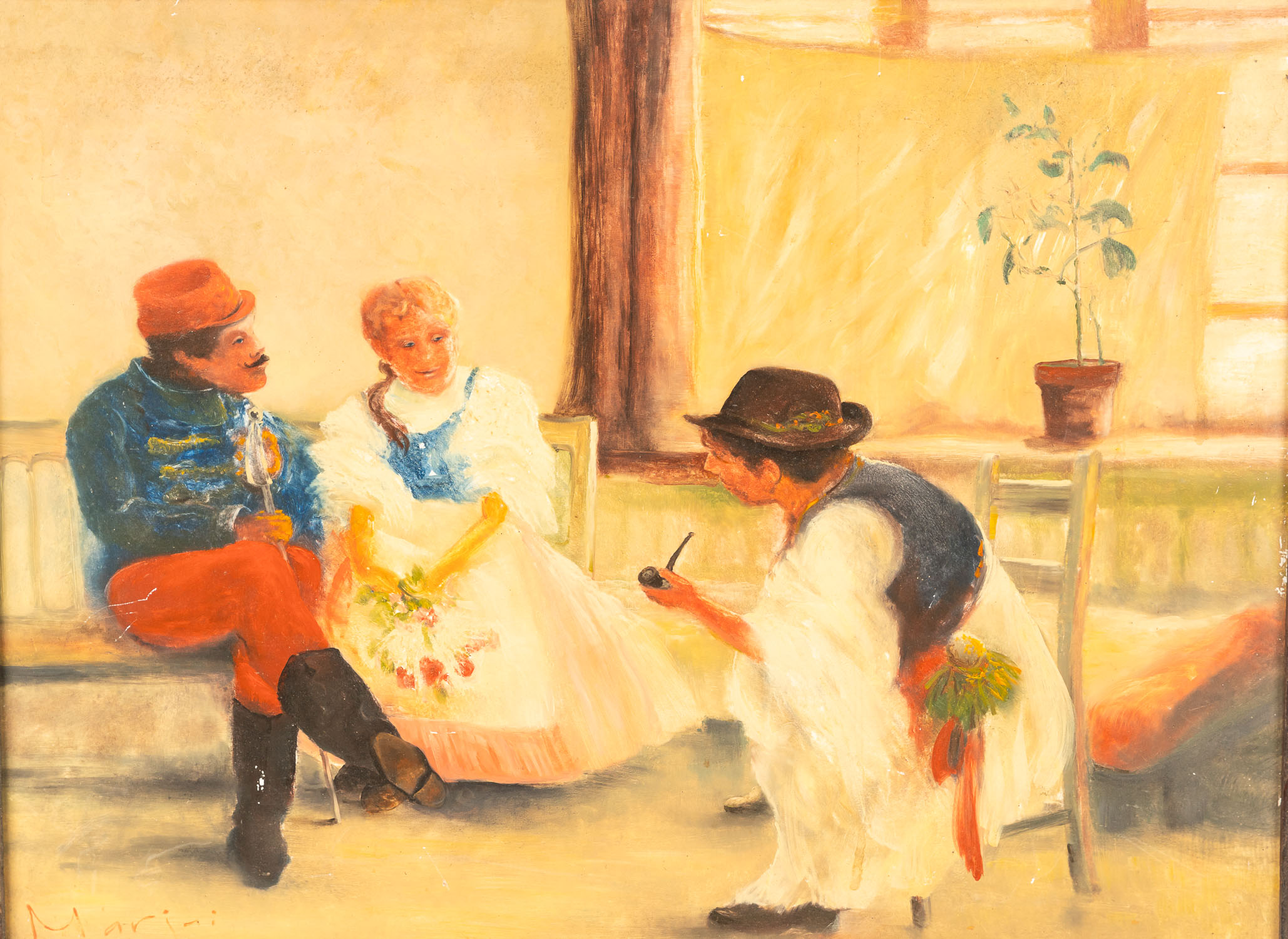 Hungarian or Slovak Artist 20th Century, Conversation . Oil on board. Signed bottom left. Framed. 60 x 80 cm