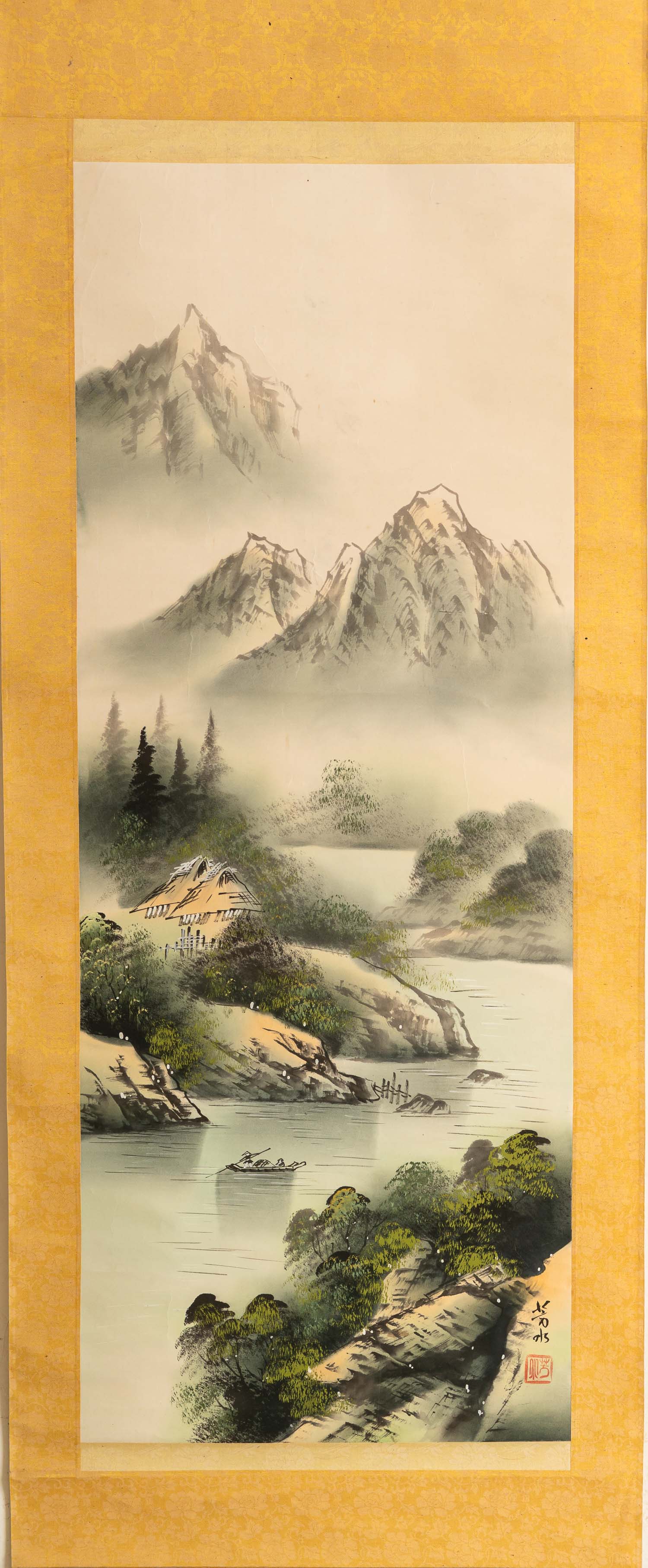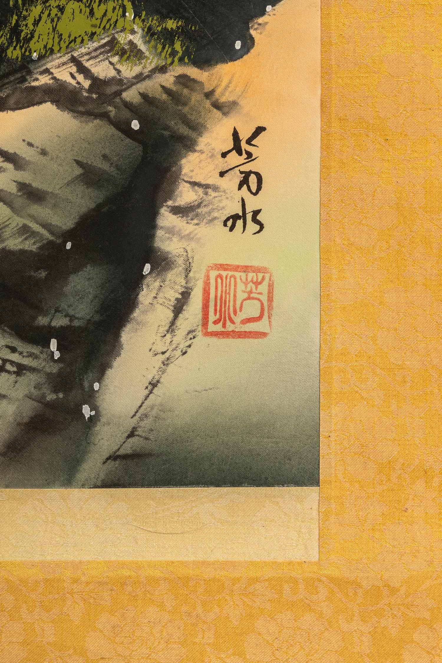 Chinese Roll Picture, landscape. Indian ink and watercolour on paper. Script, signs and stamp. On textile. 173 x 51 cm.