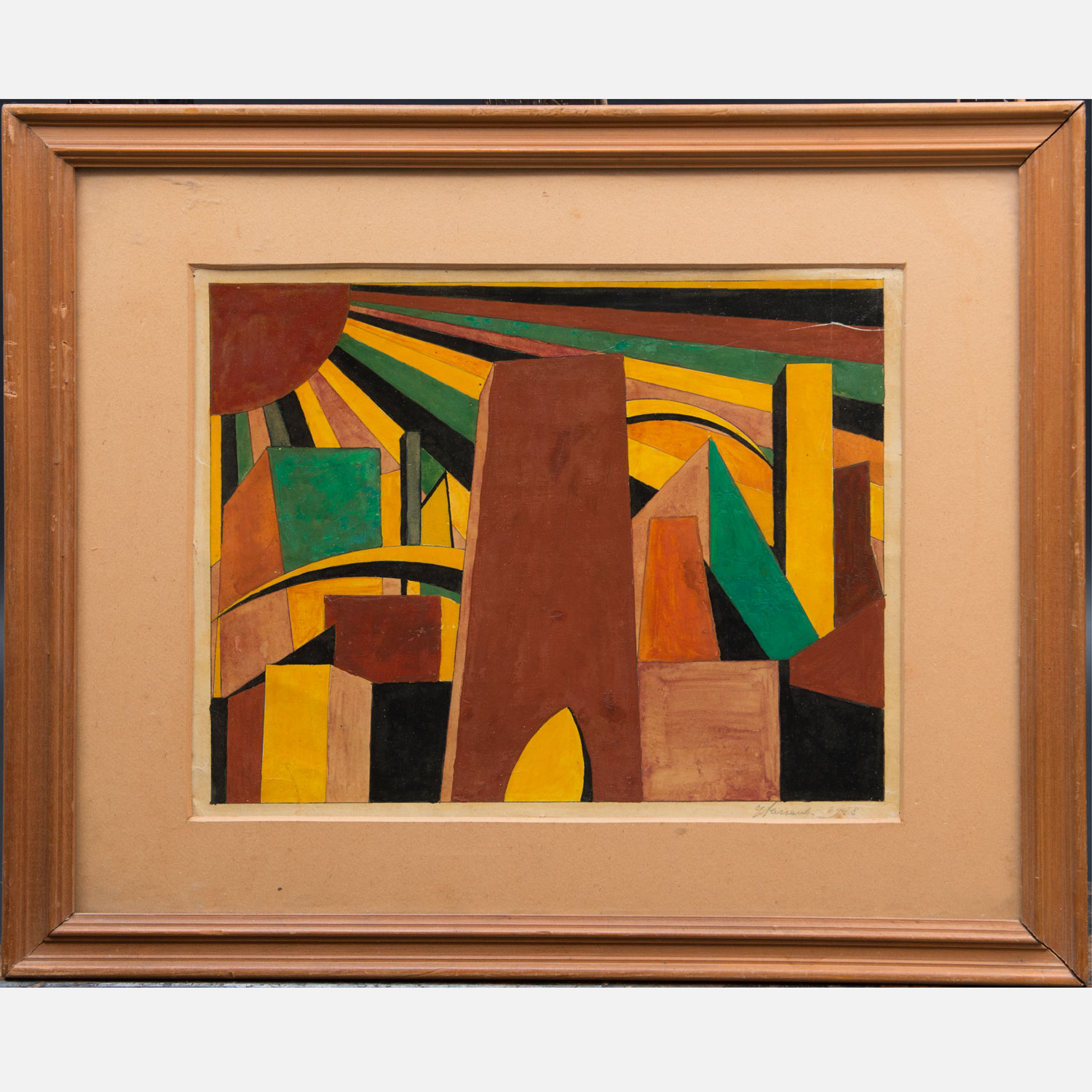 Futurist movement around 1930, Sun and houses , watercolour on paper, signed and dated 1928, framed under glass. 30 x 36 cm.