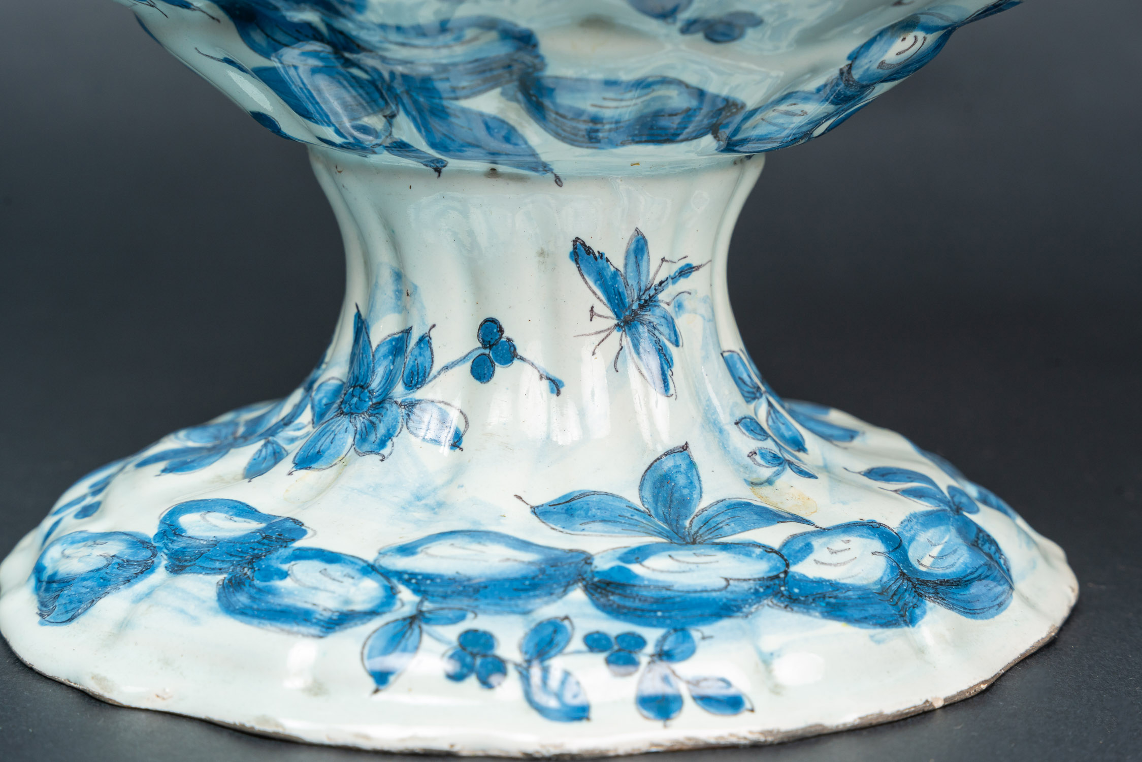 Savona Ceramic Vase, with two handgrips , fluted round shape, blue painted decorations on white ground, glazed . 18Th Century. 30 cm high
