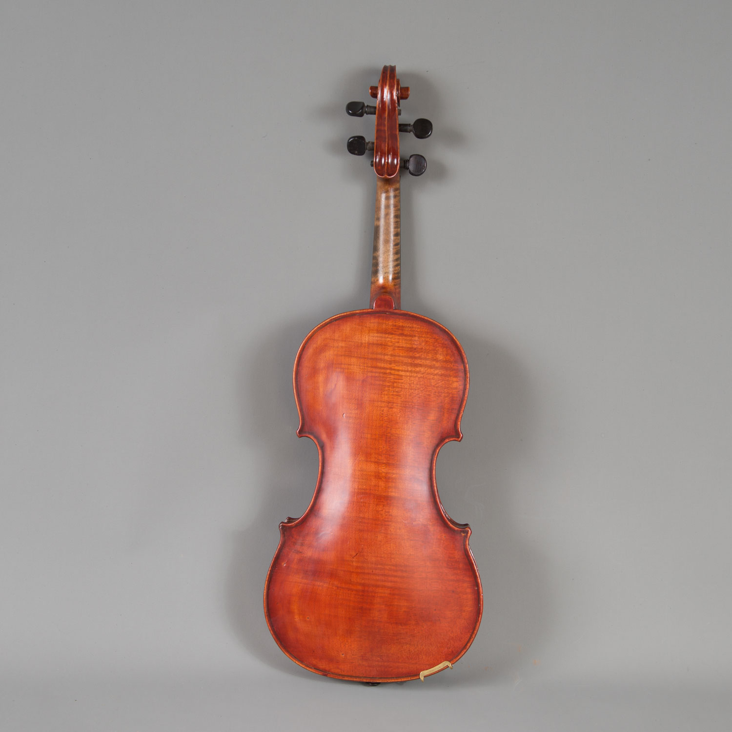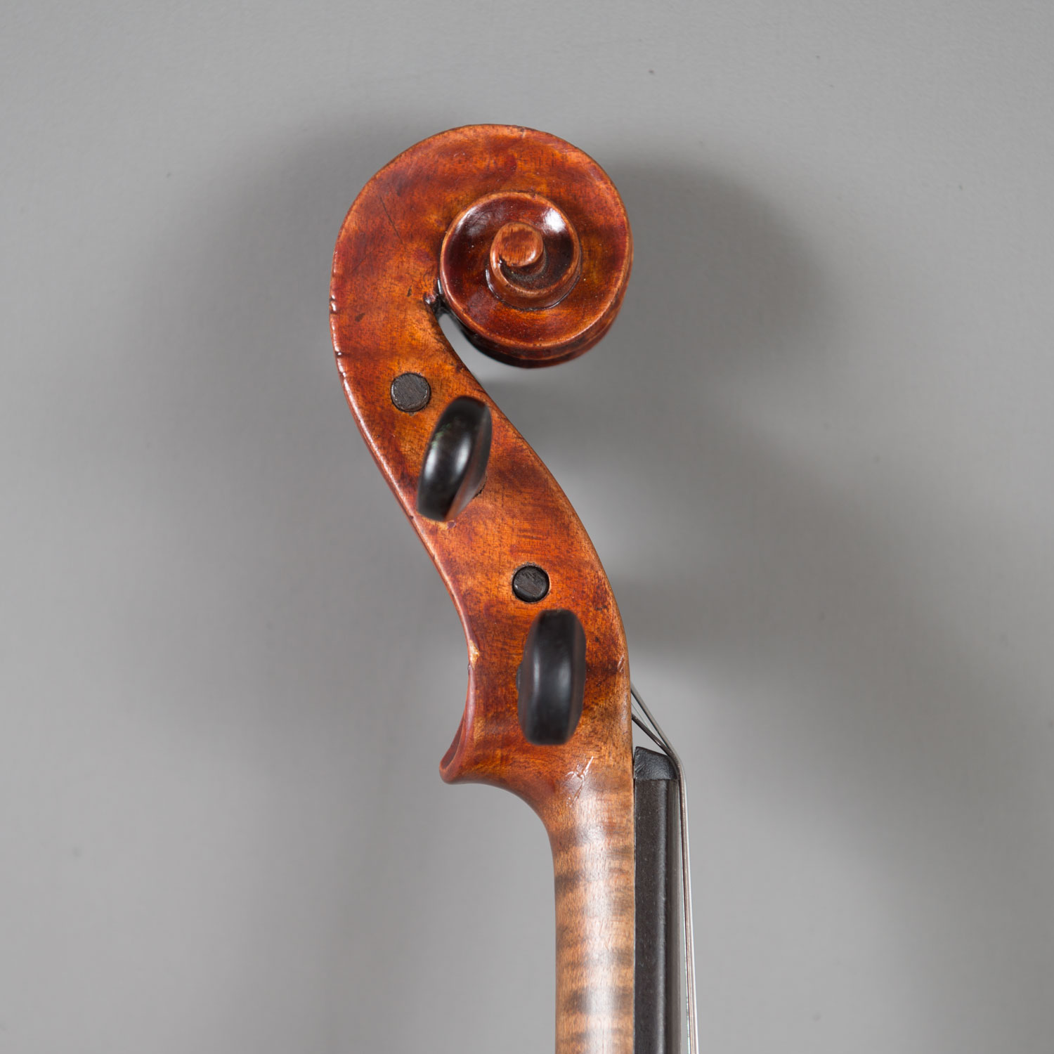 Sebastian Klotz (1696-1775) – School, violin with curved sound body. Two open note keys. Original long neck with curved scroll. Four later metal chords with later ebonized neck and stringer piece. Chinrest, endpin and soundpost from a later period. Light brown – red colour with later laquer. Playable. Small damages and signs of use. Inside old paper label described Sebastien Klotz AN 1700. In a later wooden casket. Inside green velvet. 59 cm long, 21 cm wide.