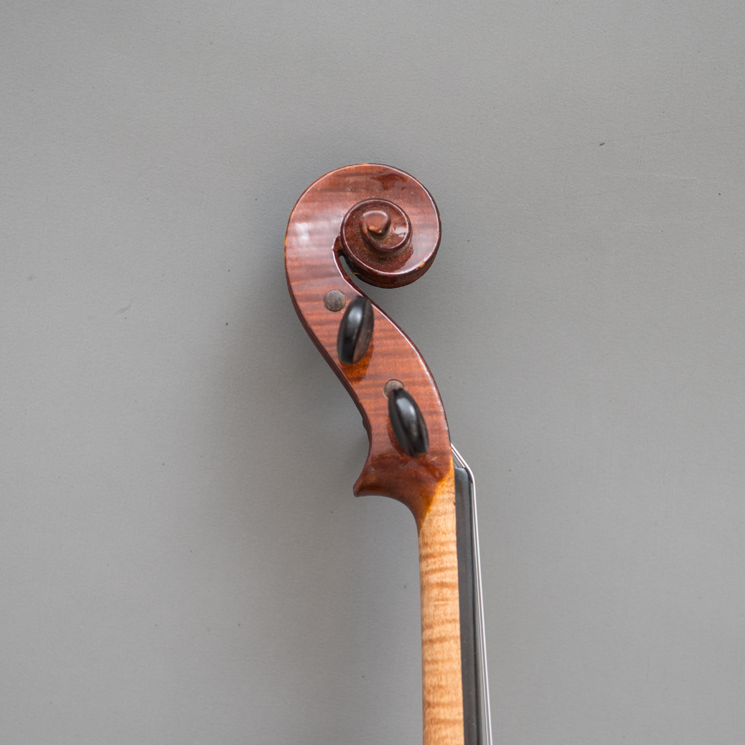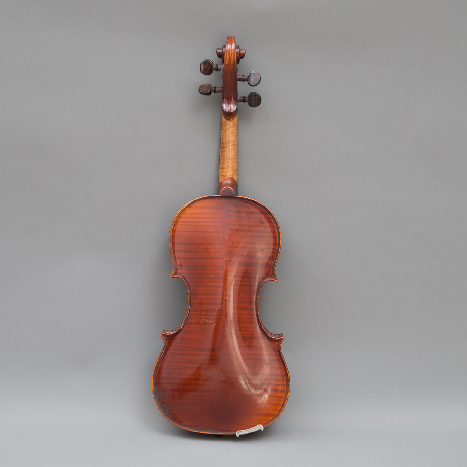 Antonio Guarnieri (1880-1952) – School, curved sound body with two open note keys. Original neck with curved scroll ending. Horizontal veniered backside with later metal strings. Chinrest, endpin and soundpost from a later period. Light brown colour with signs of use. Small damages. Later laquer. Inside paper label „Copie de Joseph Guarnierius fecit Cremonae Anno 1721“ and Cross sign with ISH. The number 21 hand written. Over that another label described Instruments de Musique Maison fonde 1850 Paul Beuscher 27 Boulevard Beaumarchais „Pres de la Bastille“ Paris. 59 cm long. In later casket including one bow.