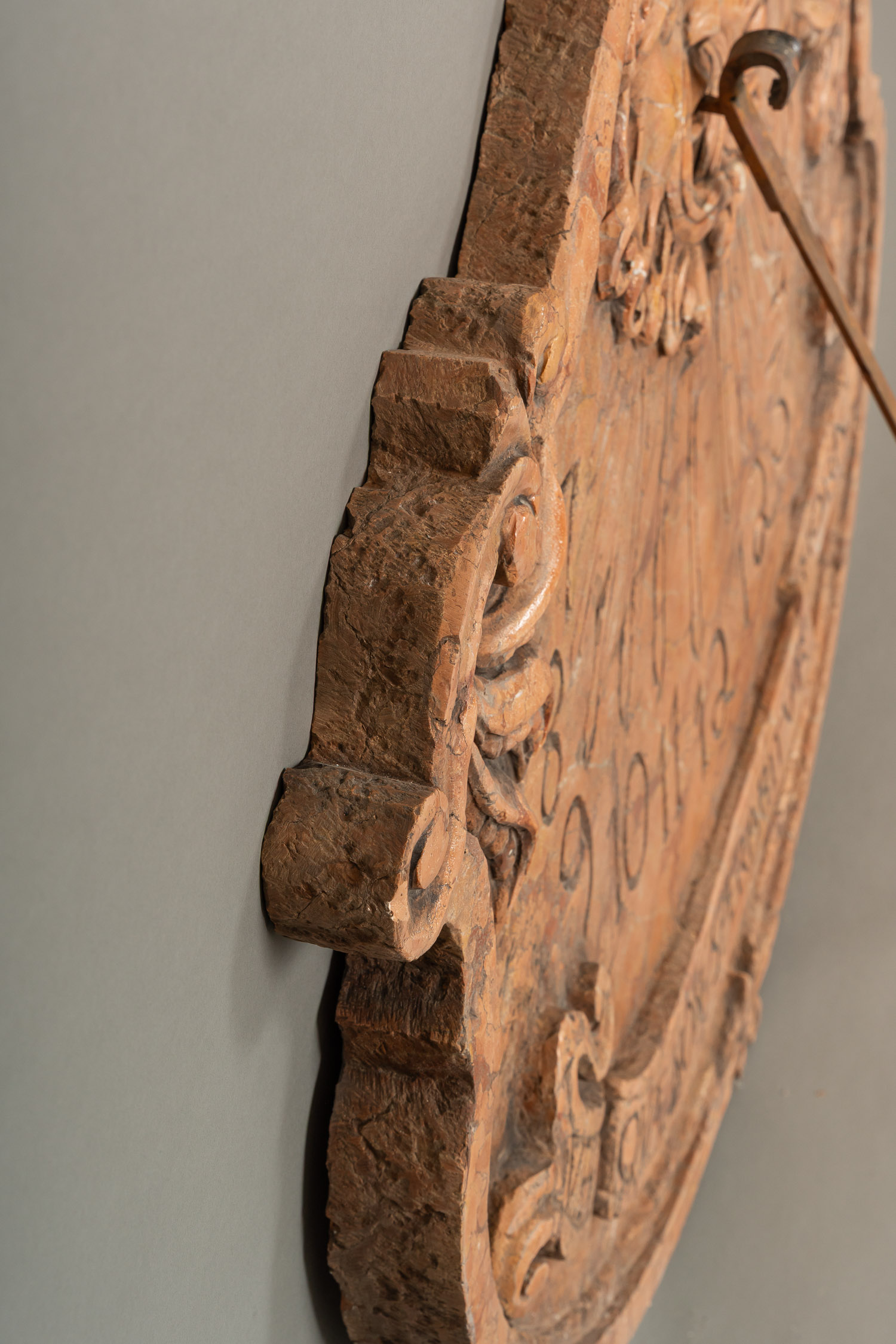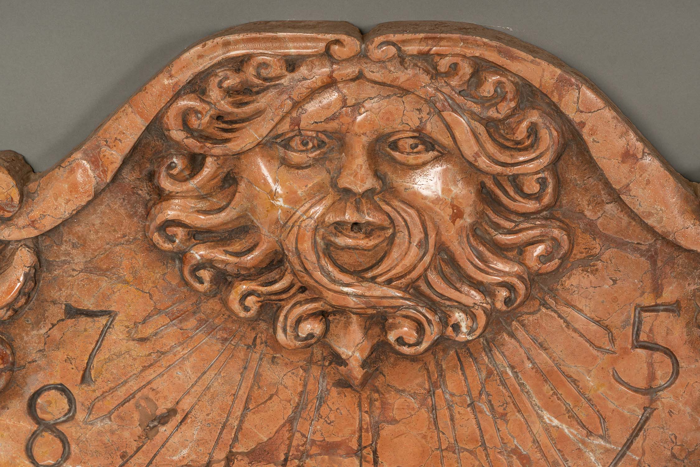 Large House Sundial, cartouche shape with numbers and inscriptions, volutes and faces. Rosso Verona marble sculpted with forged iron finial. Veneto 18/19th Century. 90 x 110 cm.