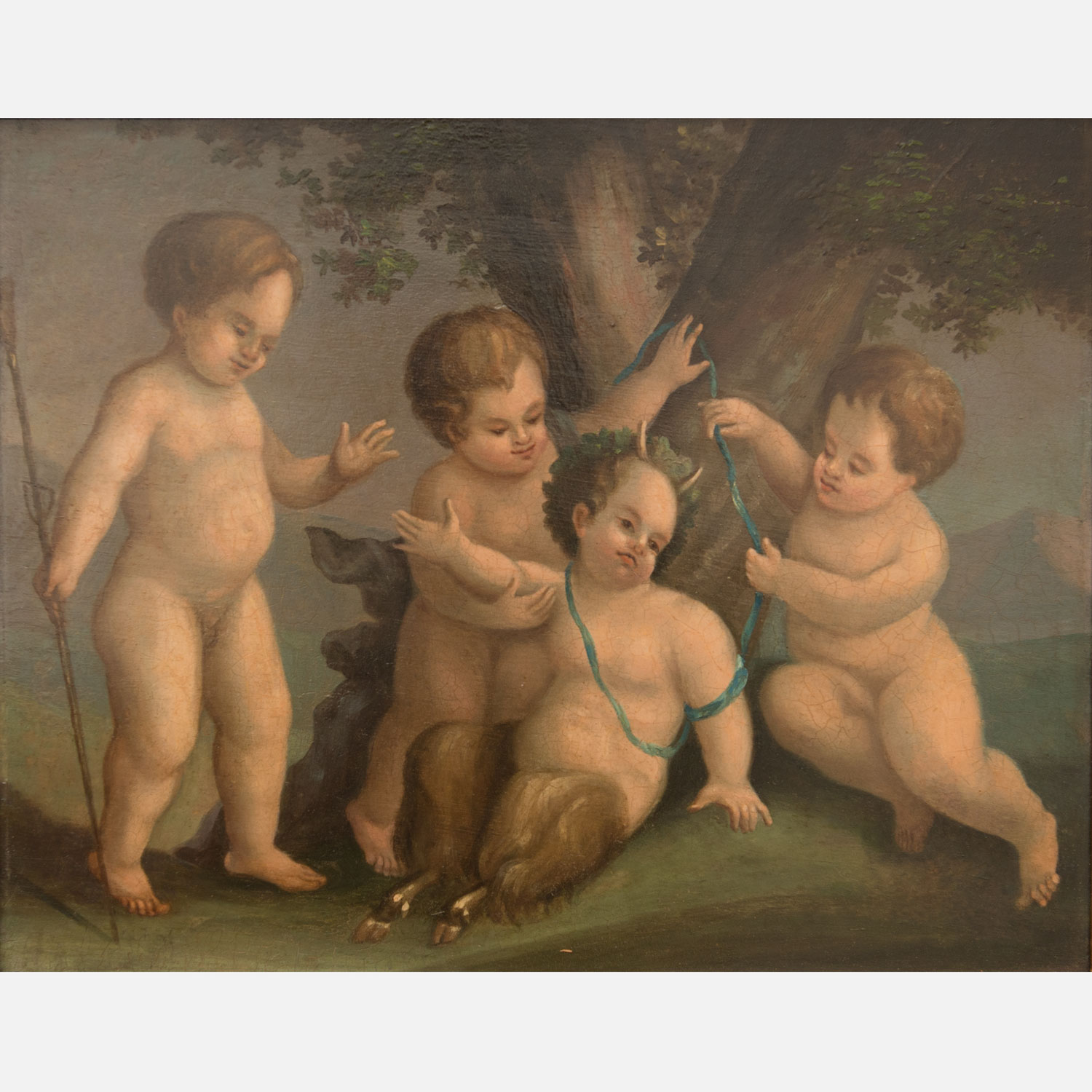 Heinrich Wilhelm Schweickardt (1747-1797) – Circle, Putis with young satyr , oil on oak panel, framed. 35X42 cm