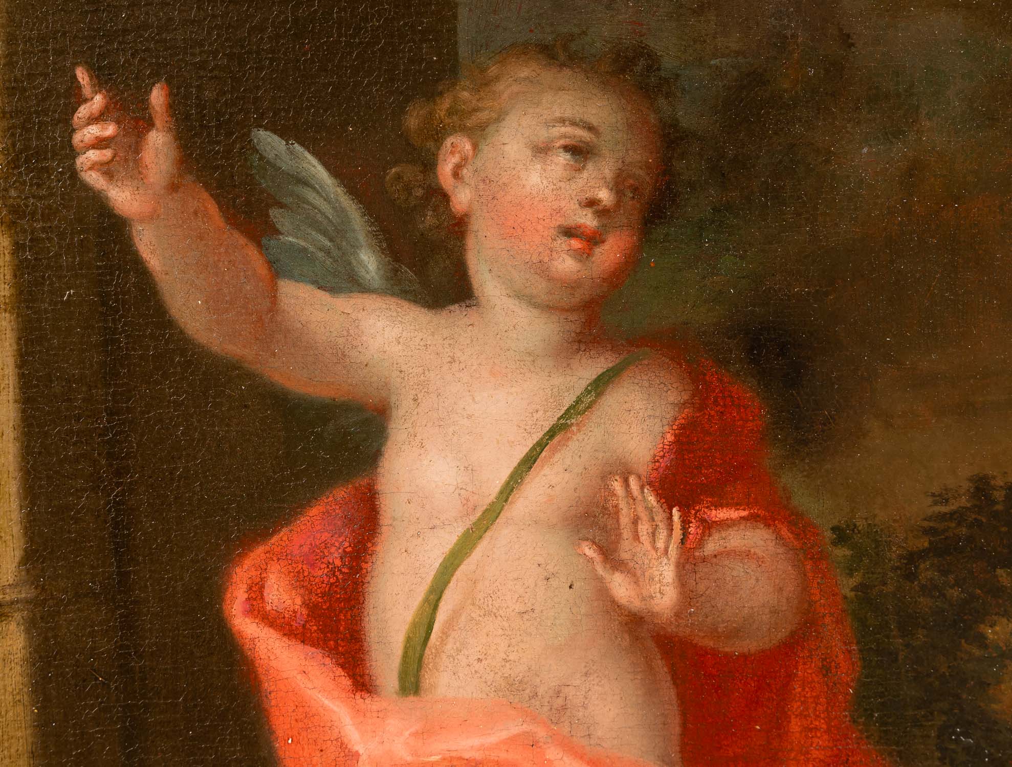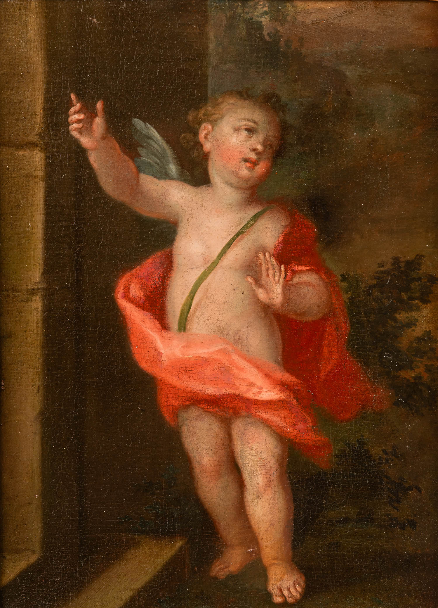 German Artist 18th Century, Angel in landscape, oil on canvas, in a gilted collectors frame. 40 x 30 cm