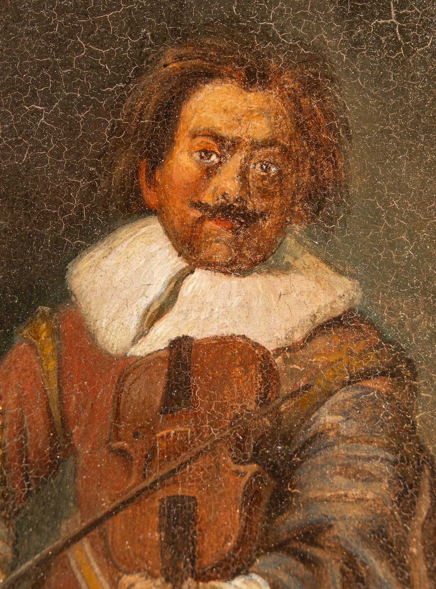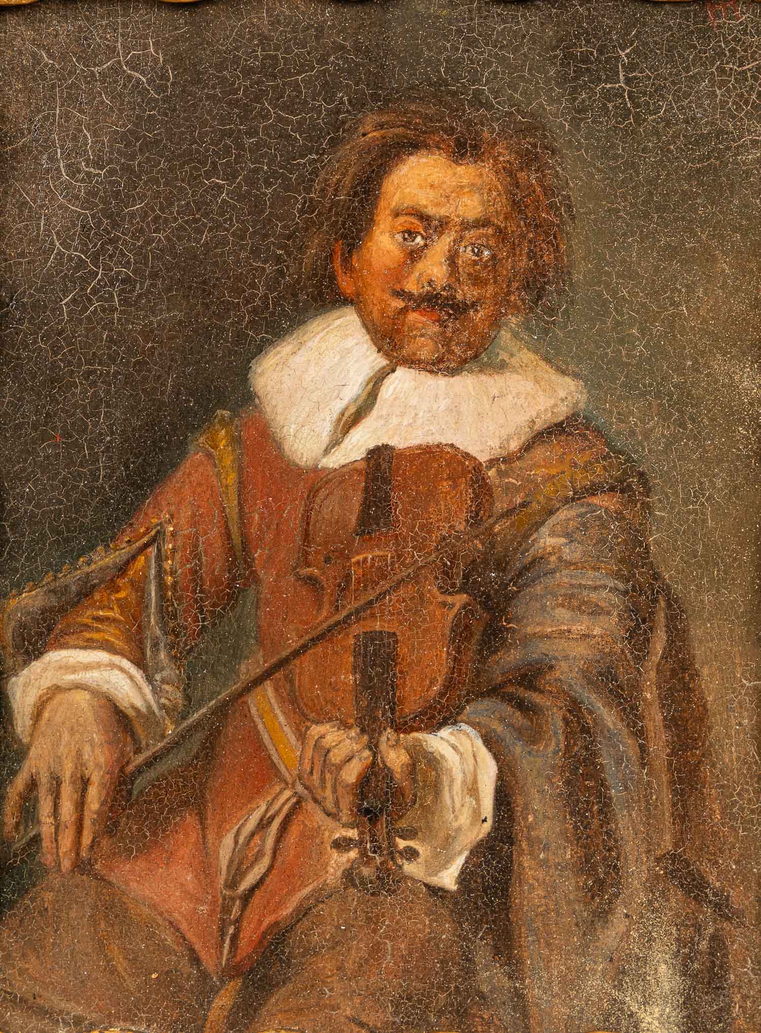 Jan Miense Molenaer ( 1610-1668) – attributed, Violinist . Oil on oak panel. Partly gilded and carved baroque frame. 20 x 14,5 cm