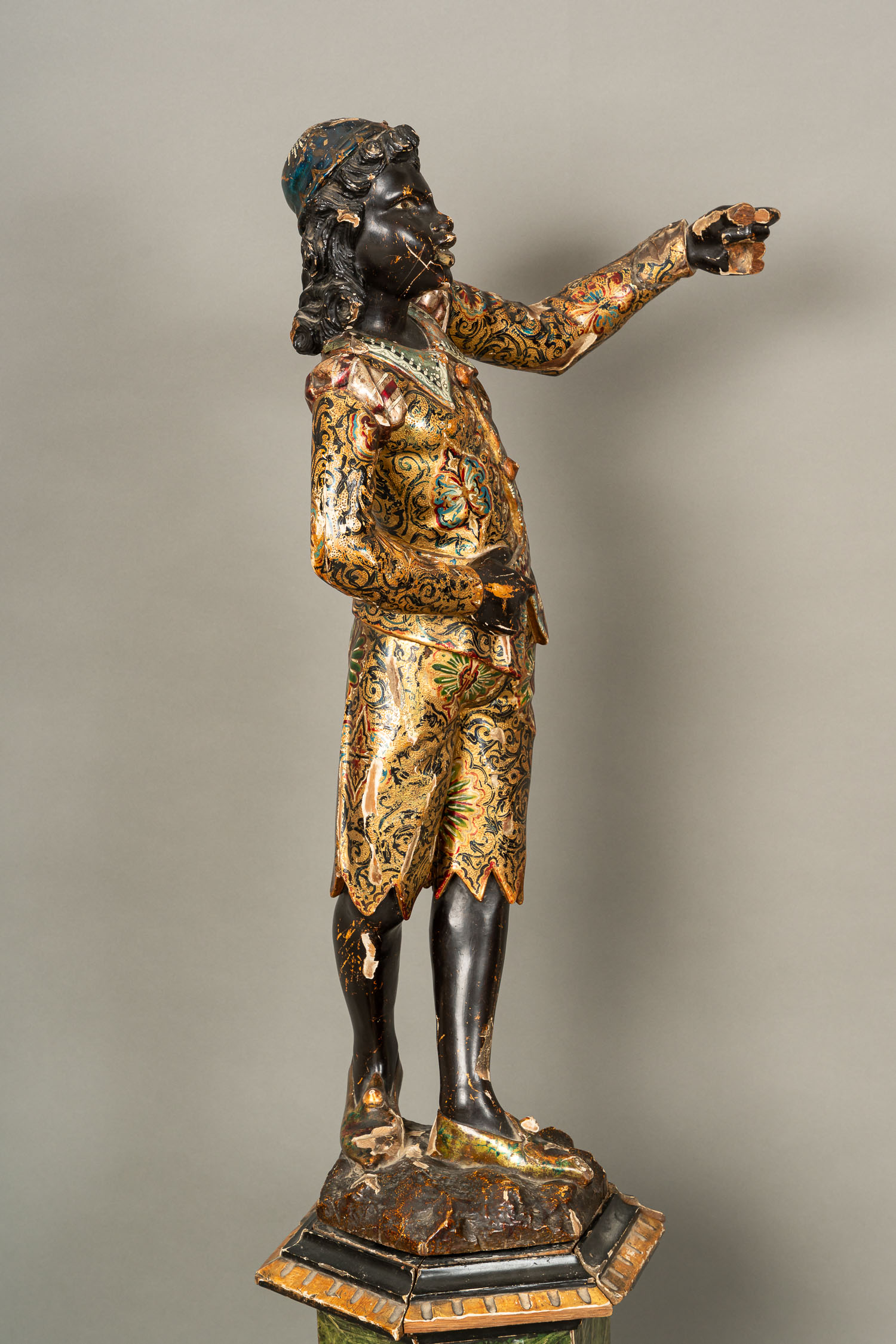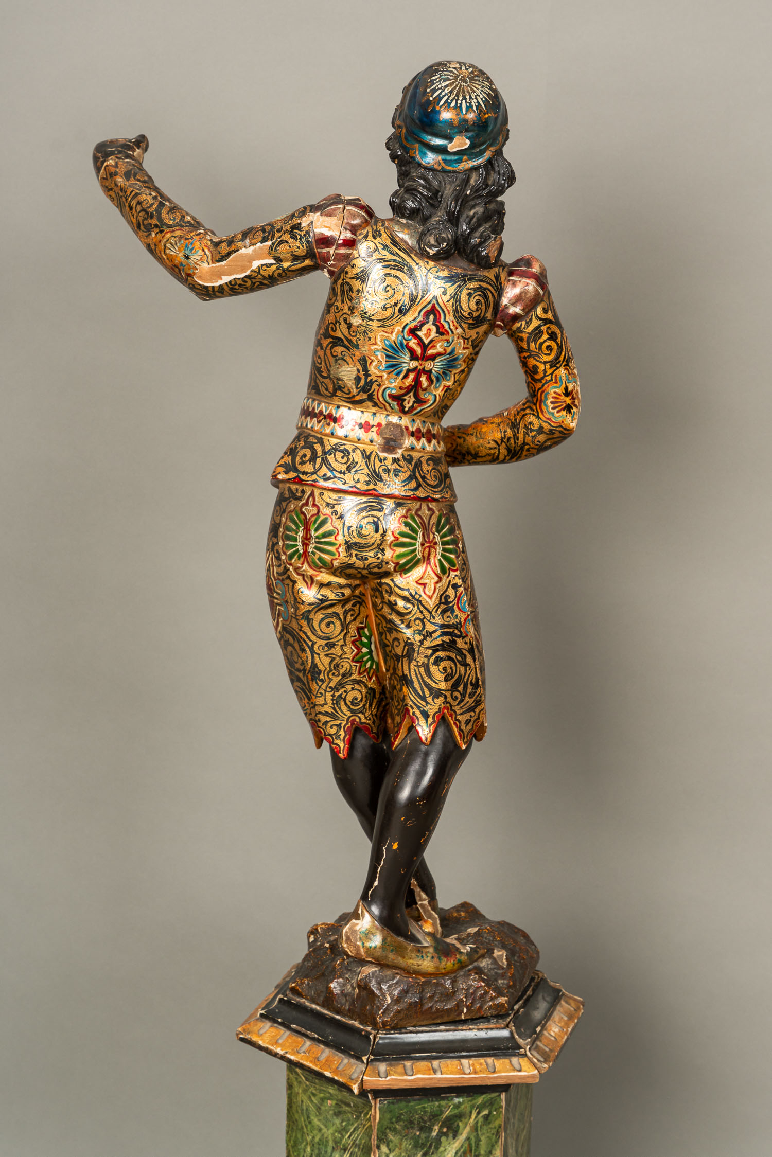 Venetian Sculpture, wood sculpted. On octagonal base. Ebonized partly gilded and painted with venetian multicolour decorations. Late 19th Century. Damages. 146 cm high.