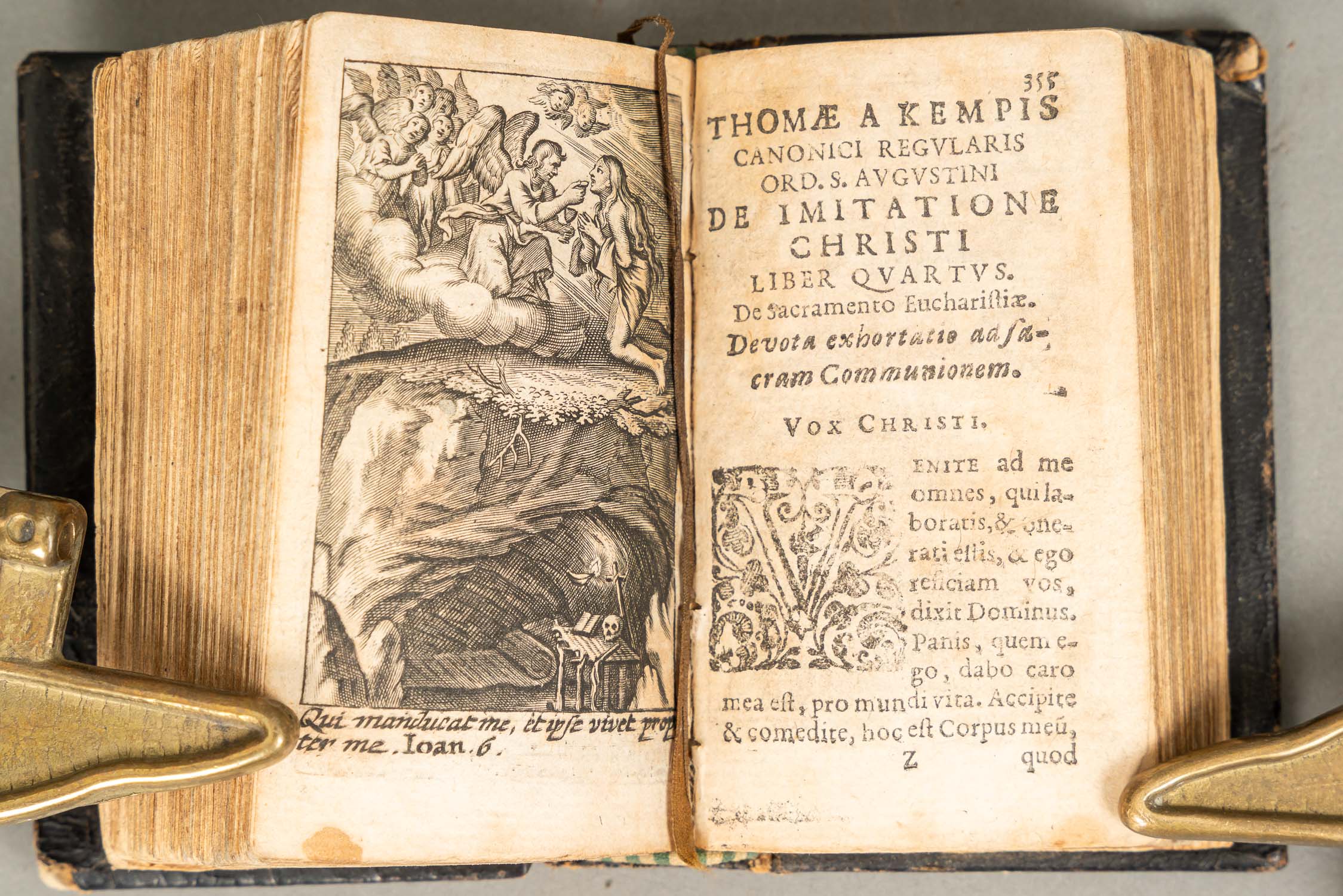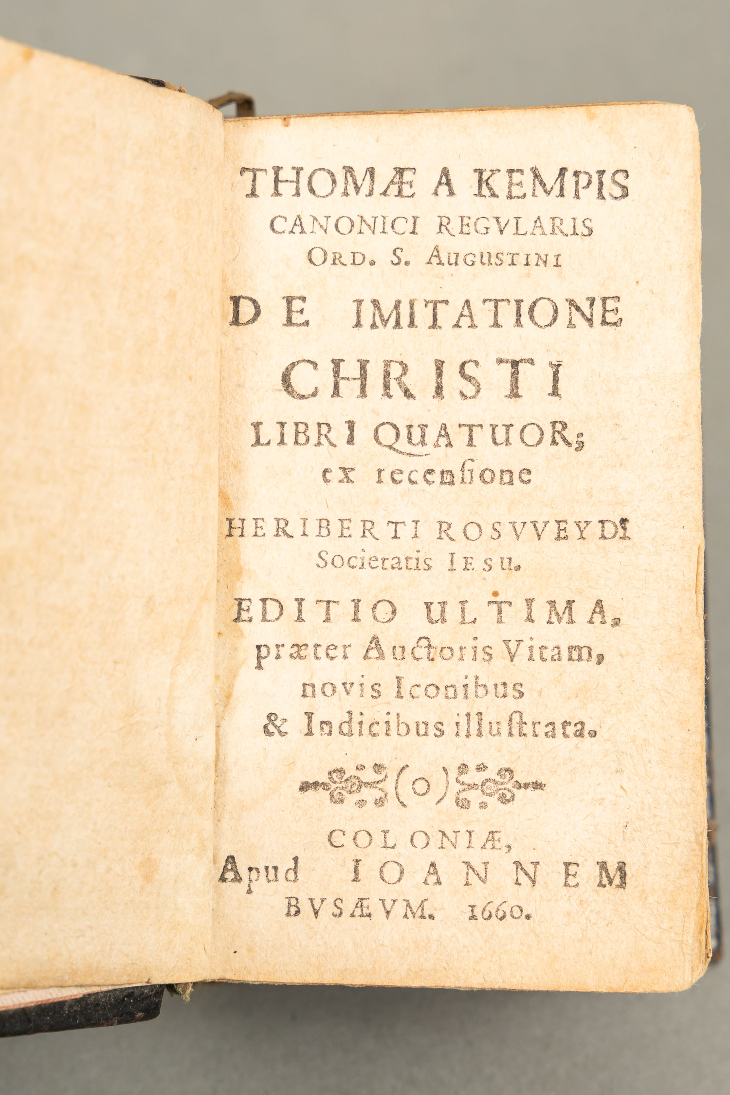 De Imitatione Christi, Heribert Rosveyidi, first edition. Thomae Kempis. Dated 1660. With 454 pages and index. Some copper print illustrations. In black leather hard cover with gild description. 8,5 x 5,5 cm.The hammer price will go directly to the social help of the Caritas of Vienna, Provenance; estate found Erzdiozese Wien.
