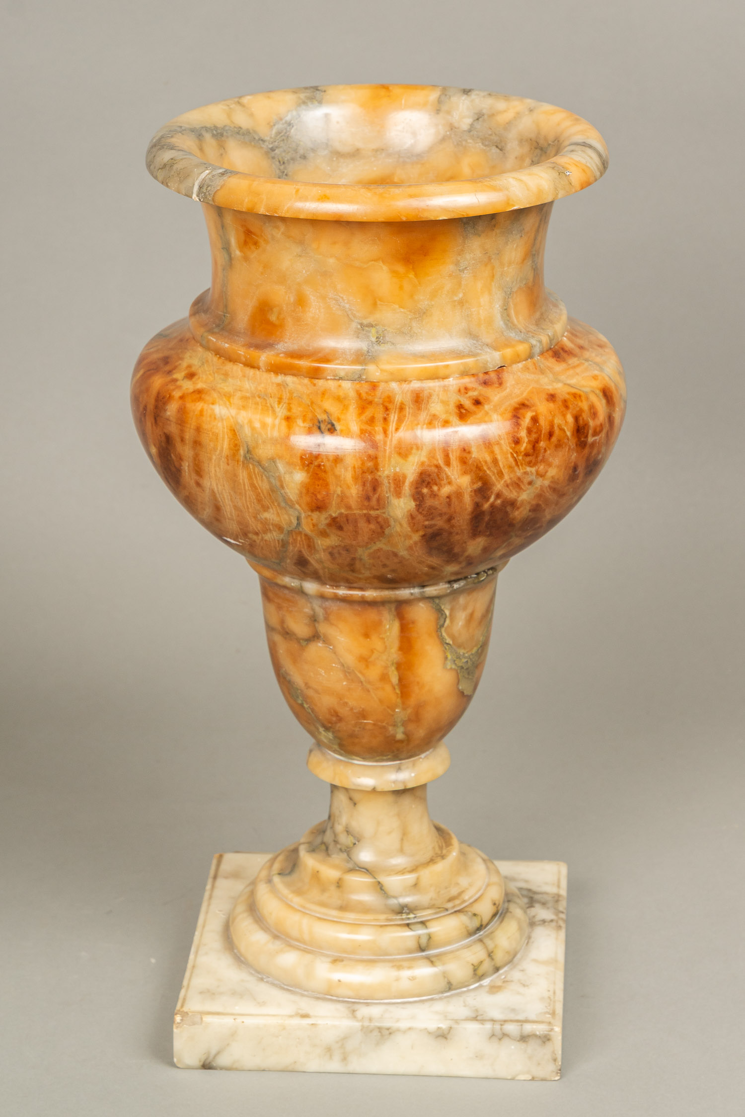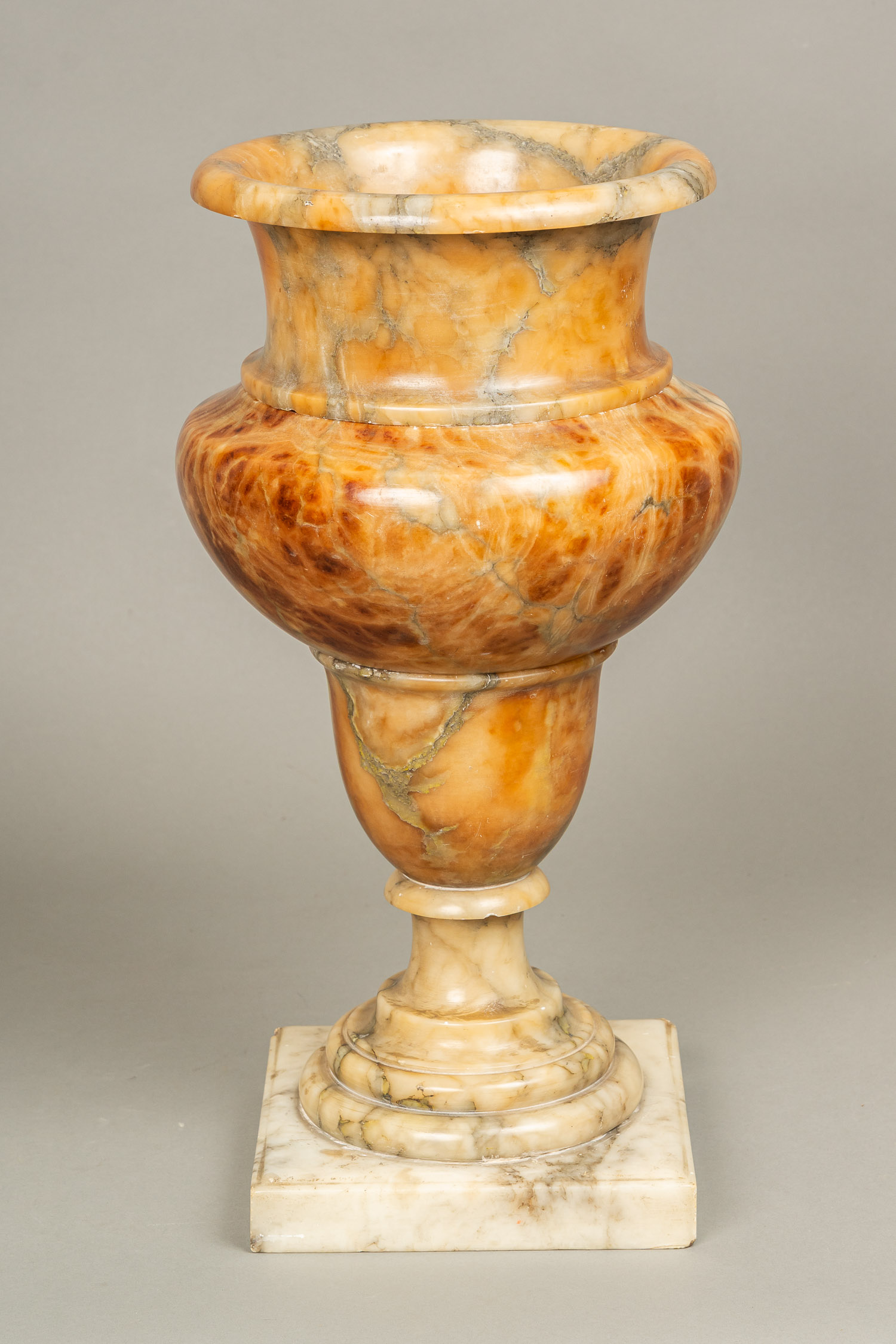Classicistic Alabaster Vase, rounded and curved form on stepped base. In three parts. Possibly egyptian alabaster. Early 19th Century. 48 cm high.